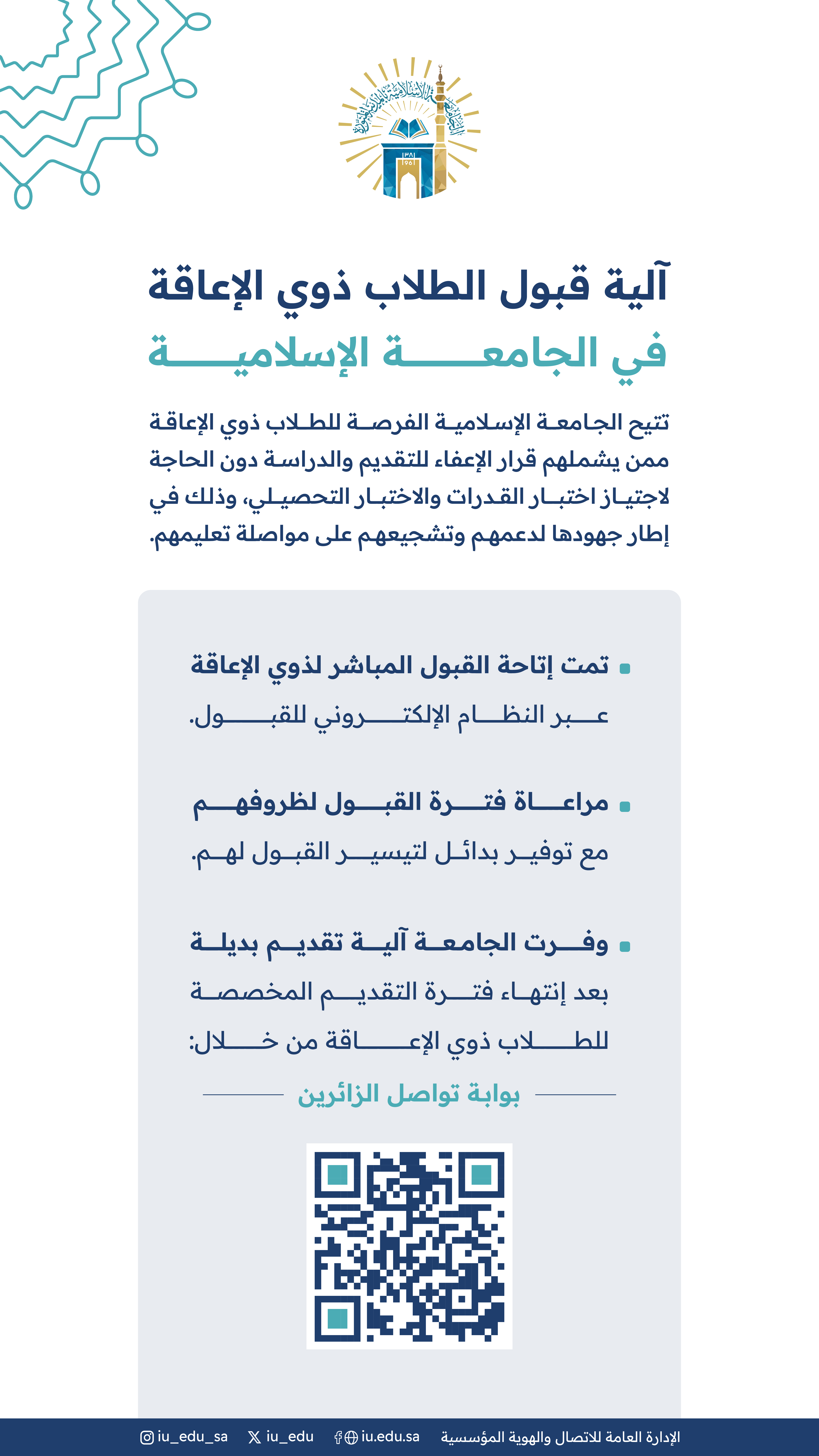 تقدم الجامعة الإسلامية بيئة تعليمية مستدامة لذوي الإعاقة، في إطار دورها الهادف لتقديم كافة التسهيلات والدعم لتحقيق طموحاتهم الأكاديمية والمهنية.