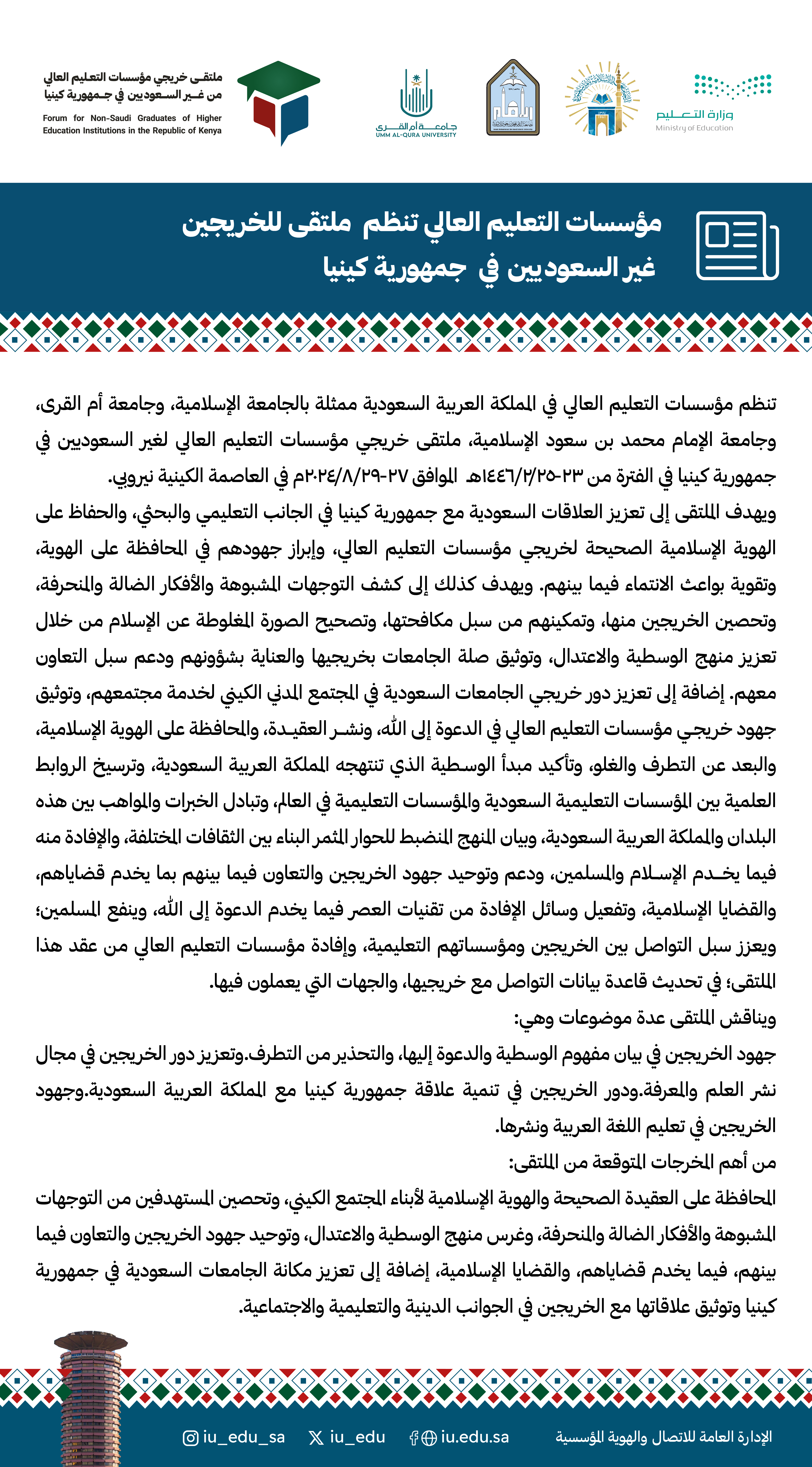 مؤسسات التعليم العالي تنظّم ملتقى الخريجين في جمهورية كينيا.