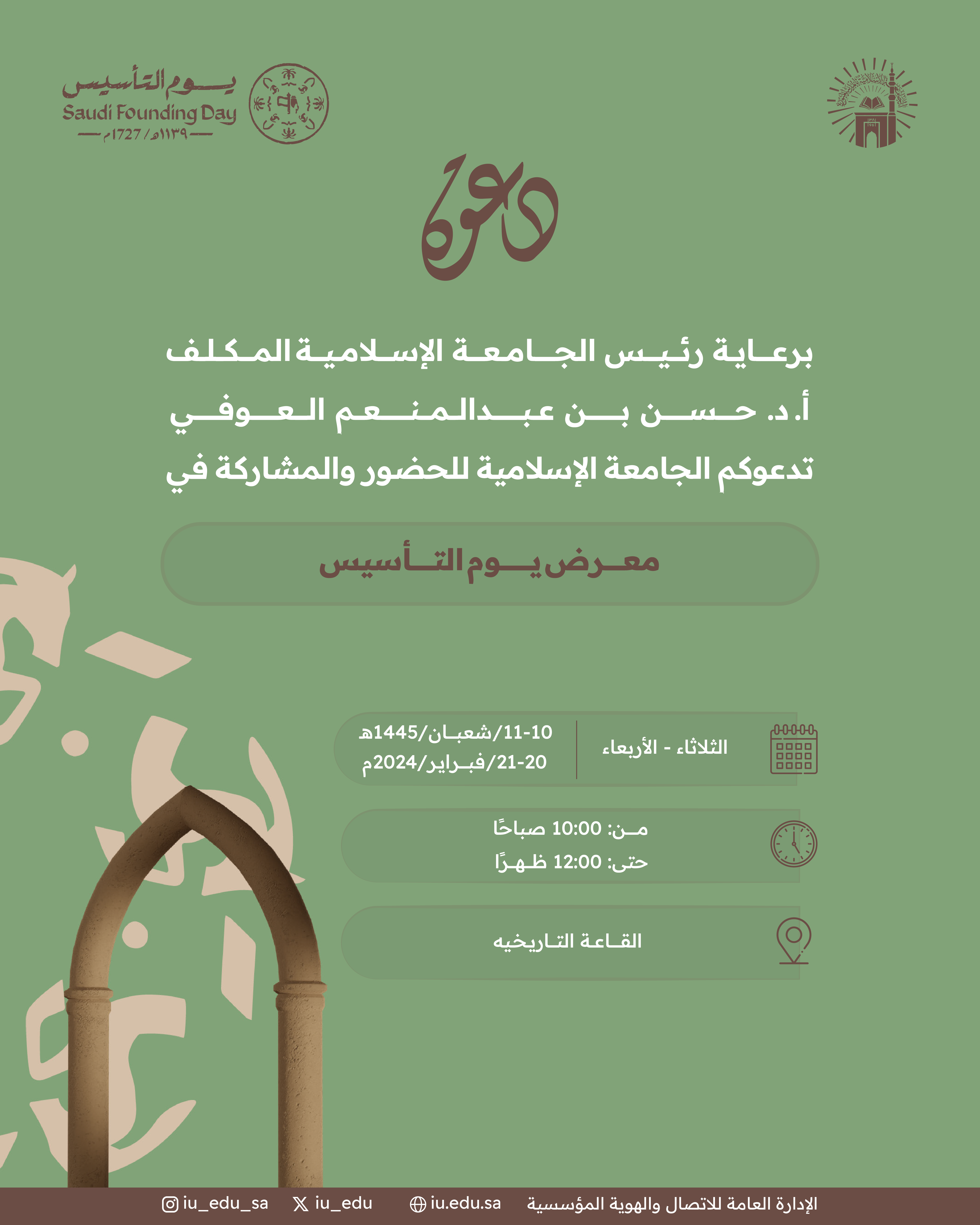 برعاية رئيس الجامعة الإسلامية المكلف أ. د. حسن بن عبدالمنعم العوفي، تدعوكم الجامعة للحضور والمشاركة في معرض يوم التأسيس بالقاعة التاريخية.