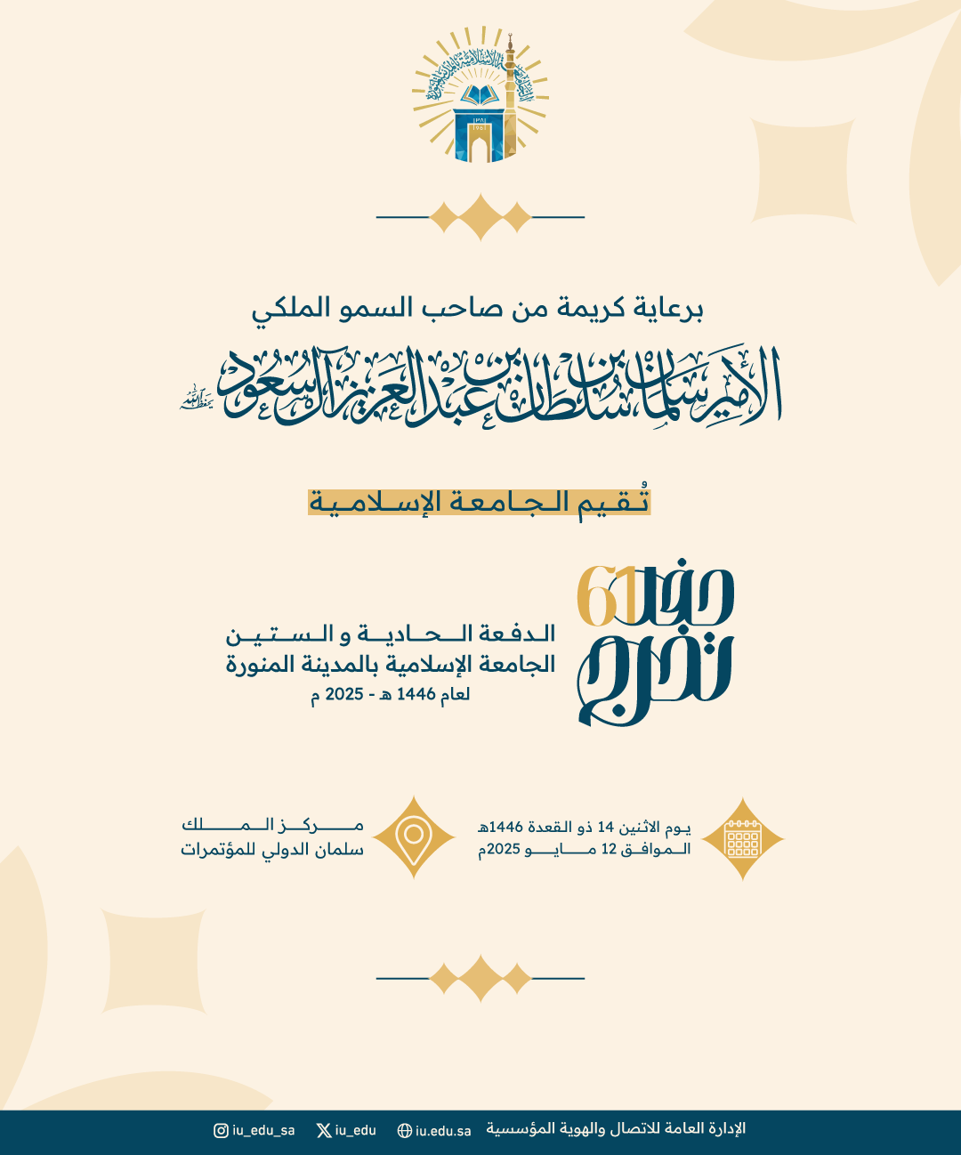 برعاية صاحب السمو الملكي الأمير سلمان بن سلطان بن عبدالعزيز آل سعود، أمير منطقة المدينة المنورة، تُقيم الجامعة الإسلامية حفل تخرج الدفعة الحادية والستين للعام الجامعي 1446هـ، في مركز الملك سلمان الدولي للمؤتمرات.