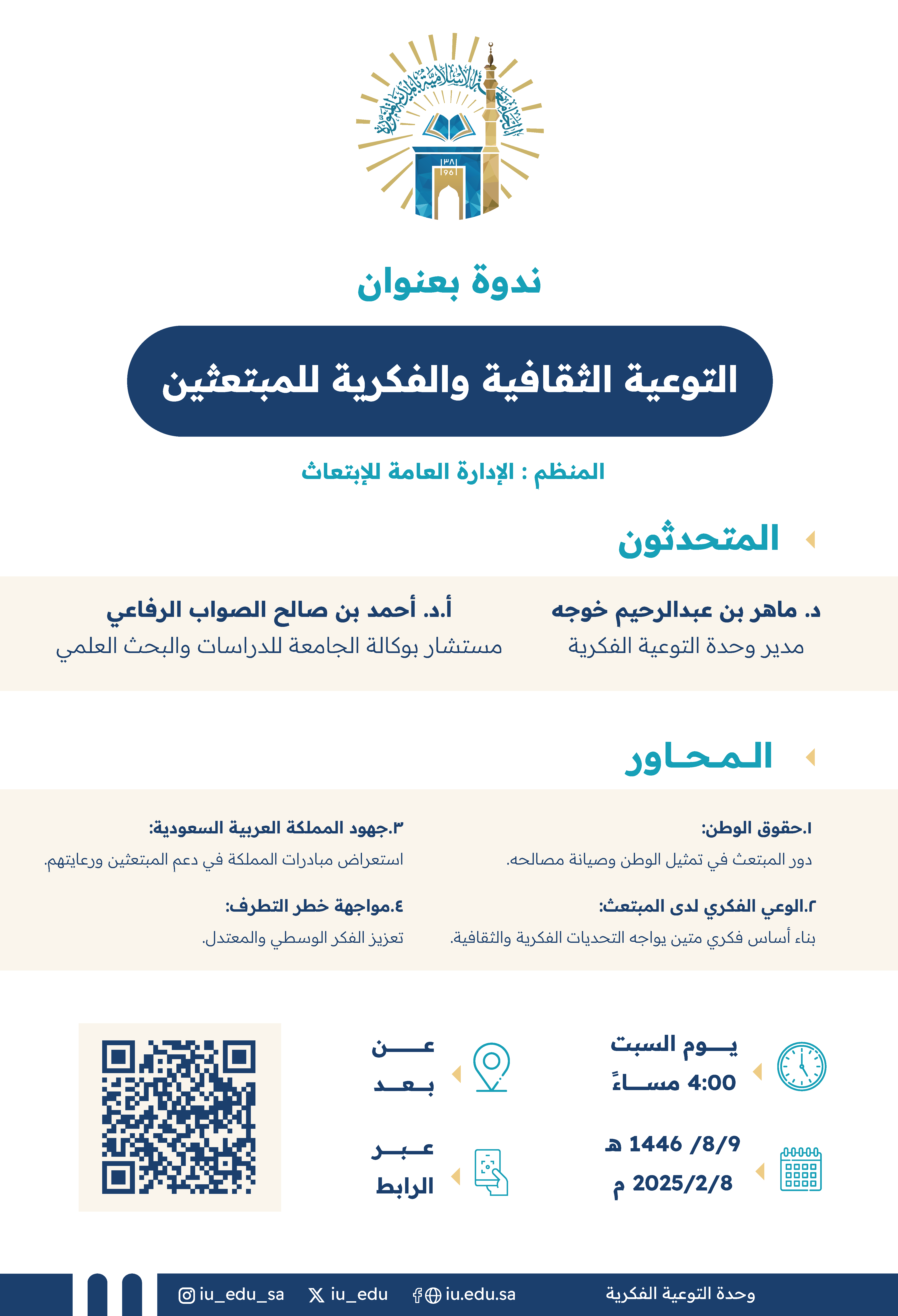 دعوة لحضور ندوة بعنوان: التوعية الثقافية والفكرية للمبتعثين