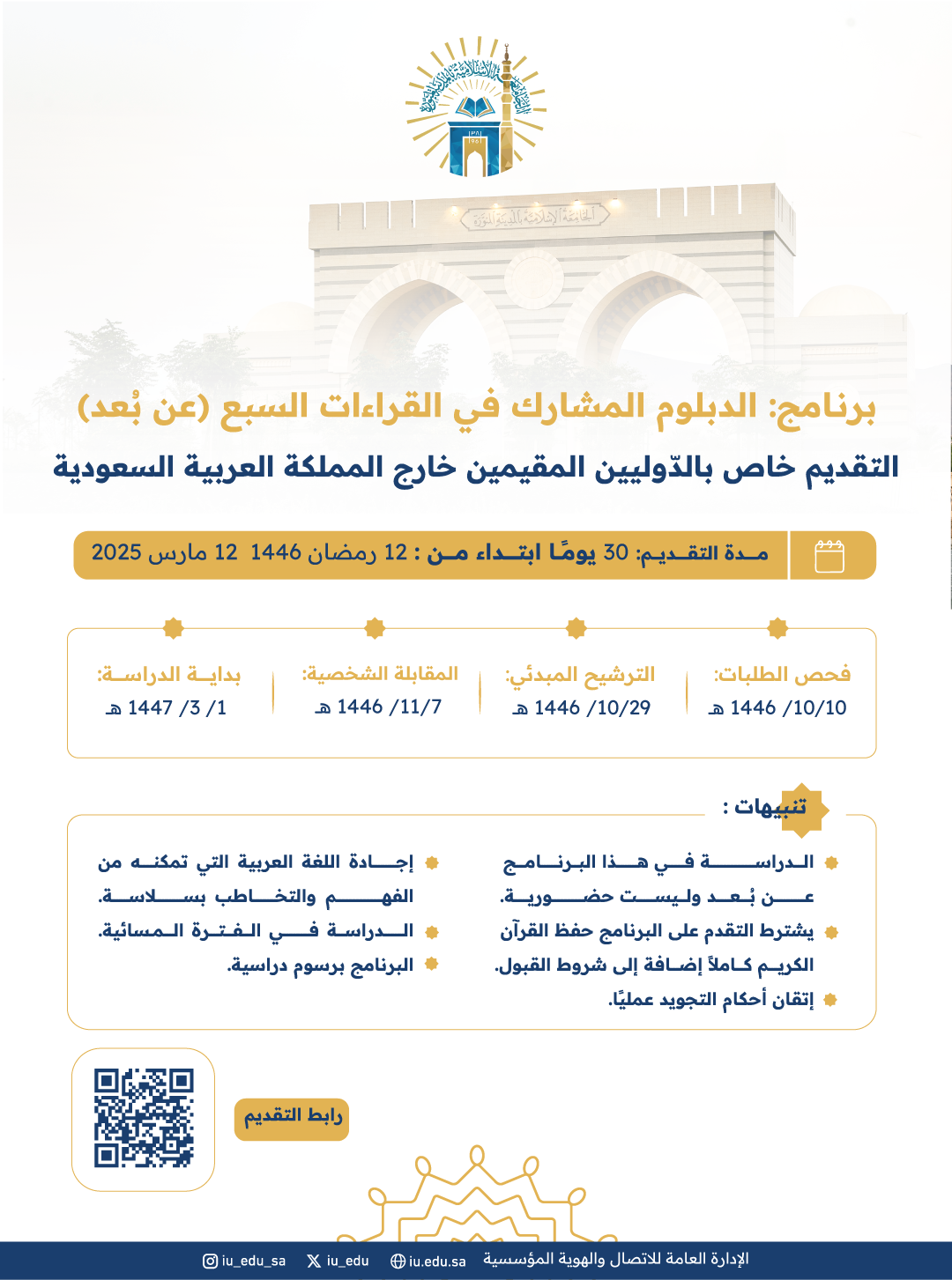 تعلن الجامعة الإسلامية عن فتح باب القبول والتقديم على برنامج الدبلوم المشارك في (القراءات السبع) عن بُعد للعام الجامعي 1447هـ.