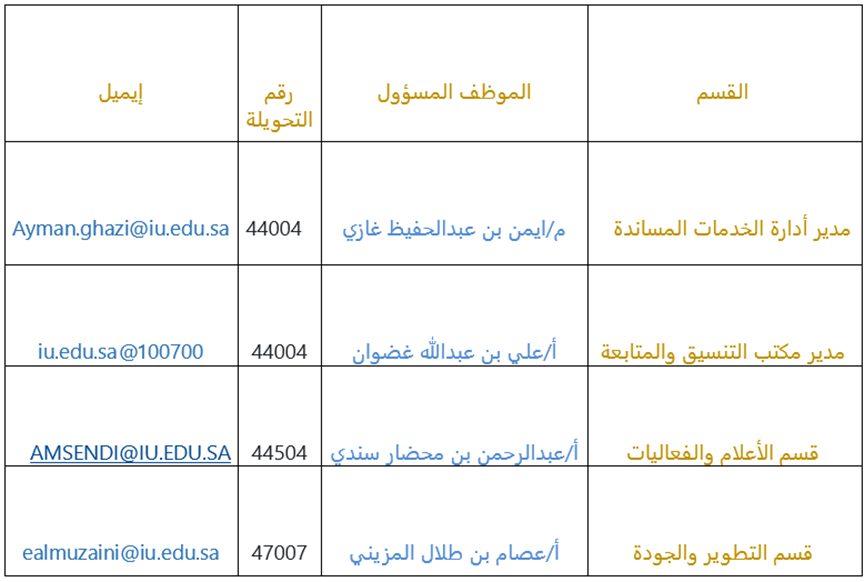 يسعدنا التواصل مع الإدارة العامة للخدمات المساندة عبر التحويلات والأيميلات التالية:
