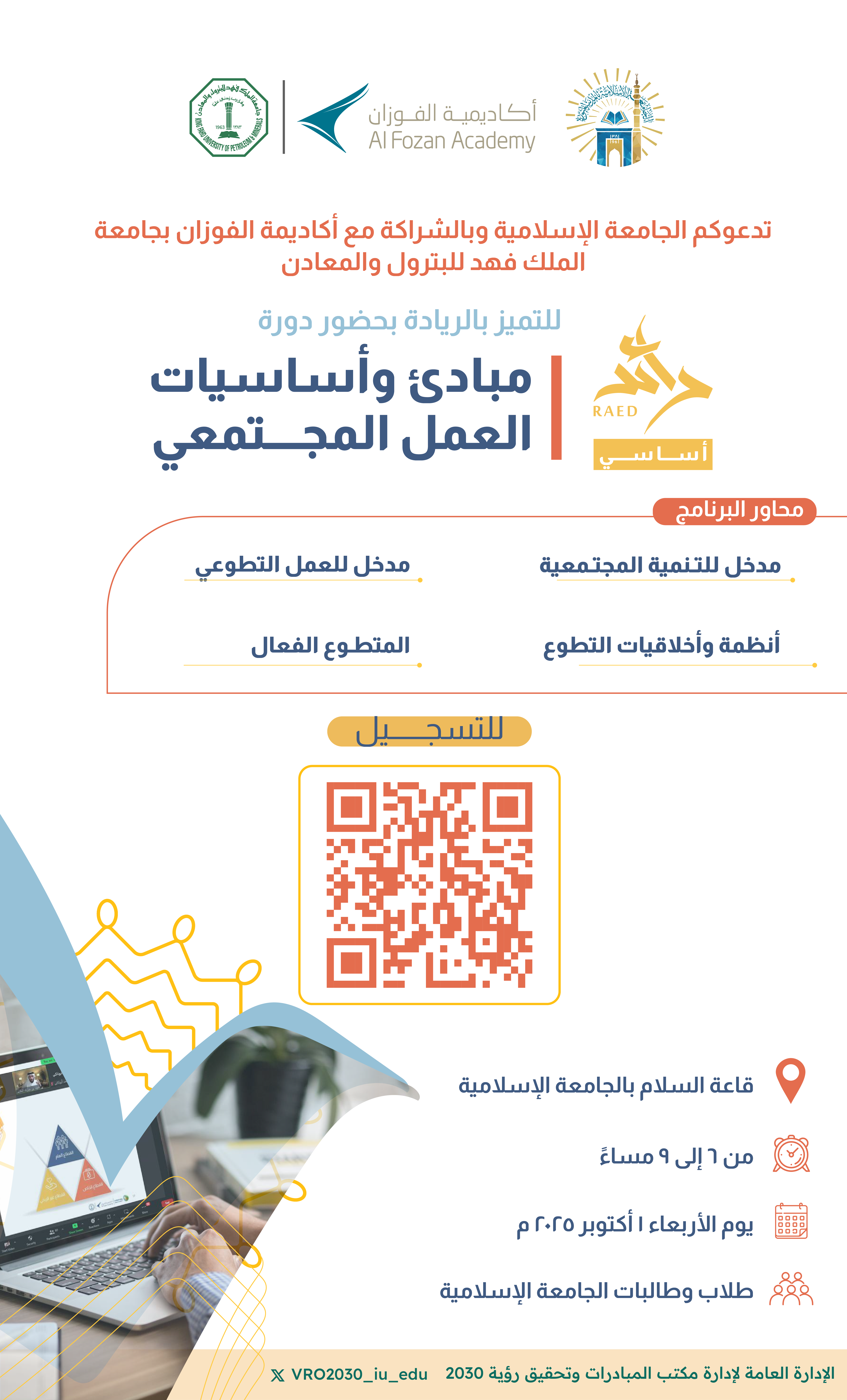 ضمن برنامج رائد وبالشراكة مع أكاديمية الفوزان، تدعوكم الجامعة الإسلامية لحضور دورة (حضوري): مبادئ وأساسيات العمل المجتمعي.