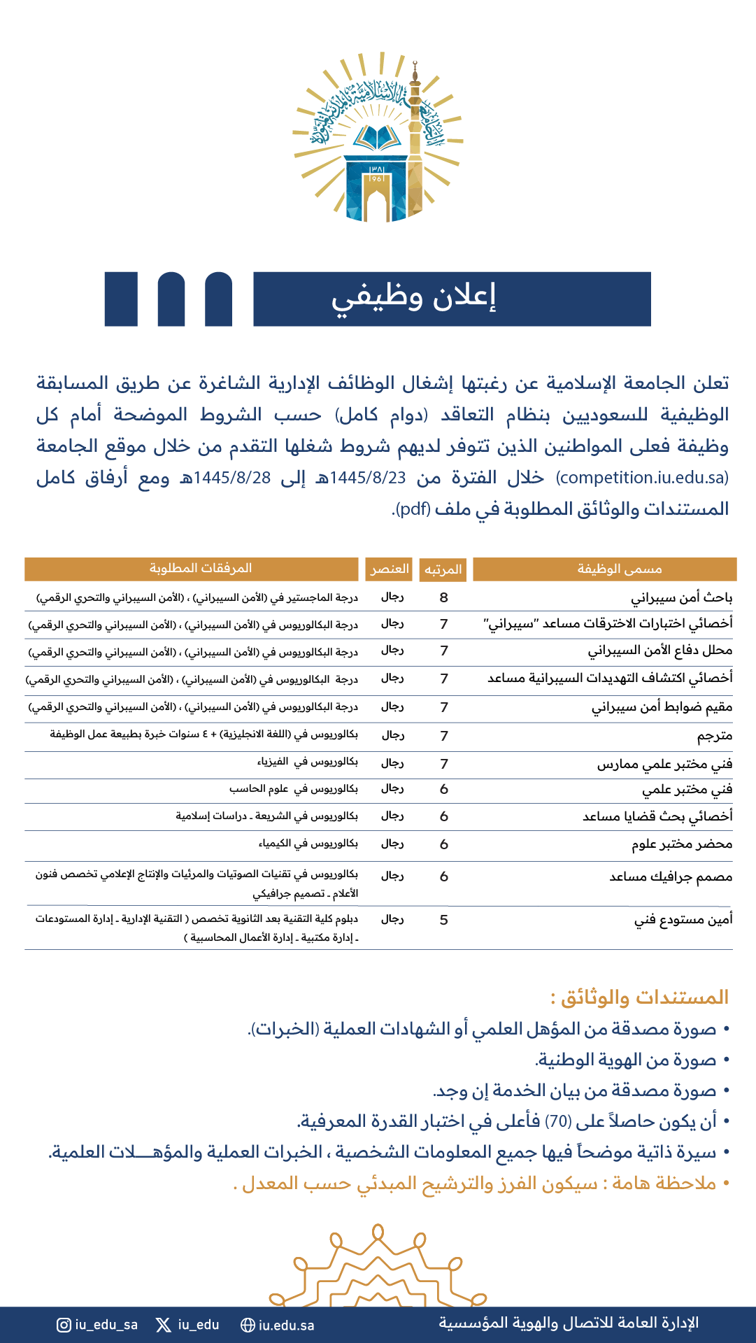 تعلن الجامعة الإسلامية عن رغبتها في إشغال الوظائف الإدارية الشاغرة للسعوديين بنظام التعاقد (دوام كامل)