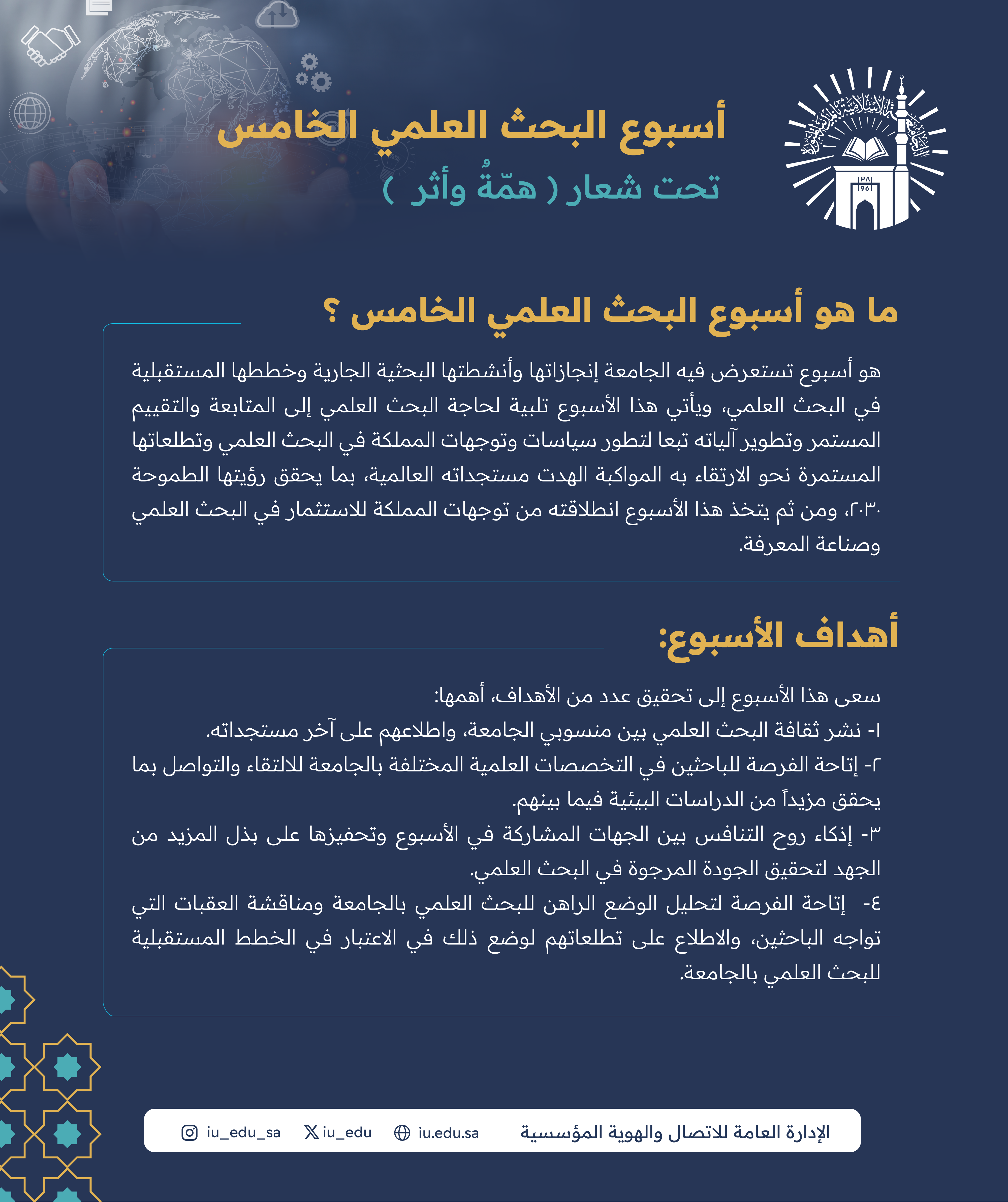 تقدّم الجامعة الإسلامية خلال أسبوع البحث العلمي الخامس، تحت شعار (همّةٌ وأثر)، العديد من الأنشطة والفعاليات، إيمانًا منها بأهمية البحث العلمي، وللتعريف بجهود الجامعة في دعمه.