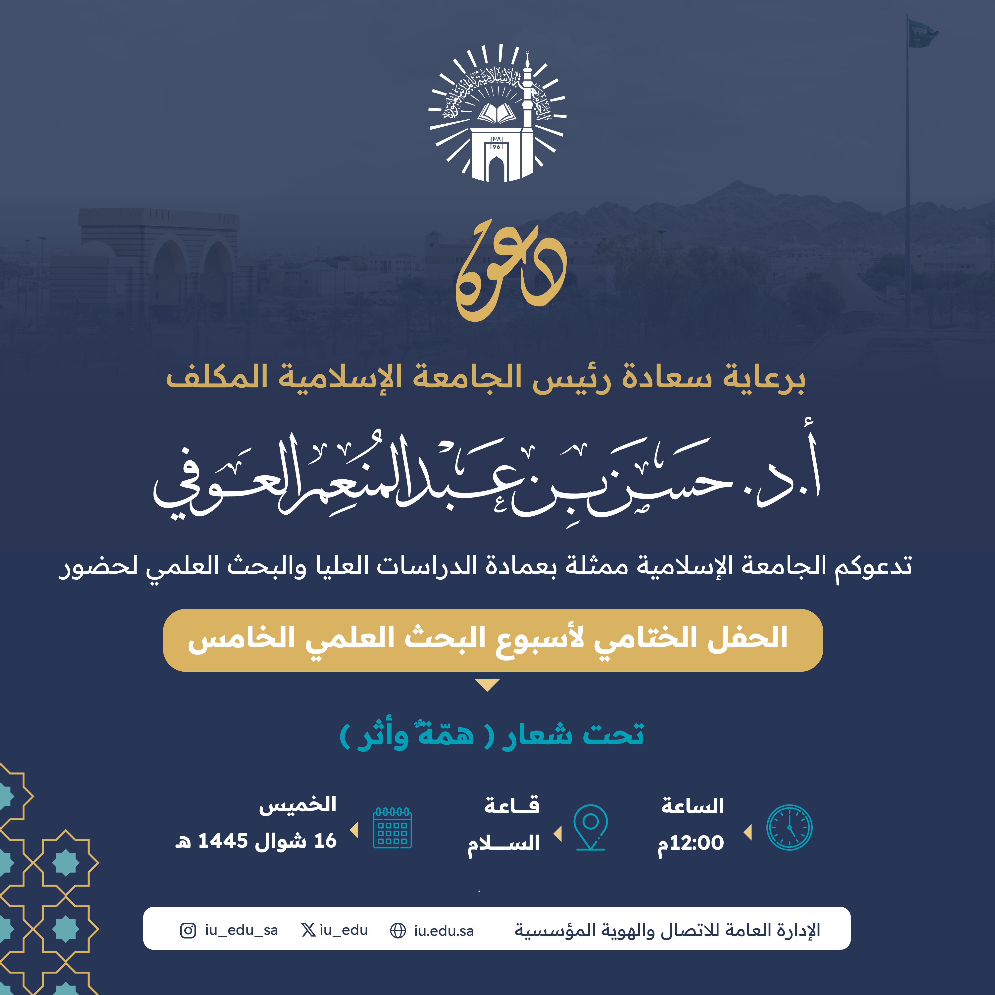 برعاية رئيس الجامعة الإسلامية المكلف، أ. د. حسن بن عبدالمنعم العوفي، تدعوكم الجامعة لحضور الحفل الختامي لـ أسبوع البحث العلمي الخامس (همّةٌ وأثر)