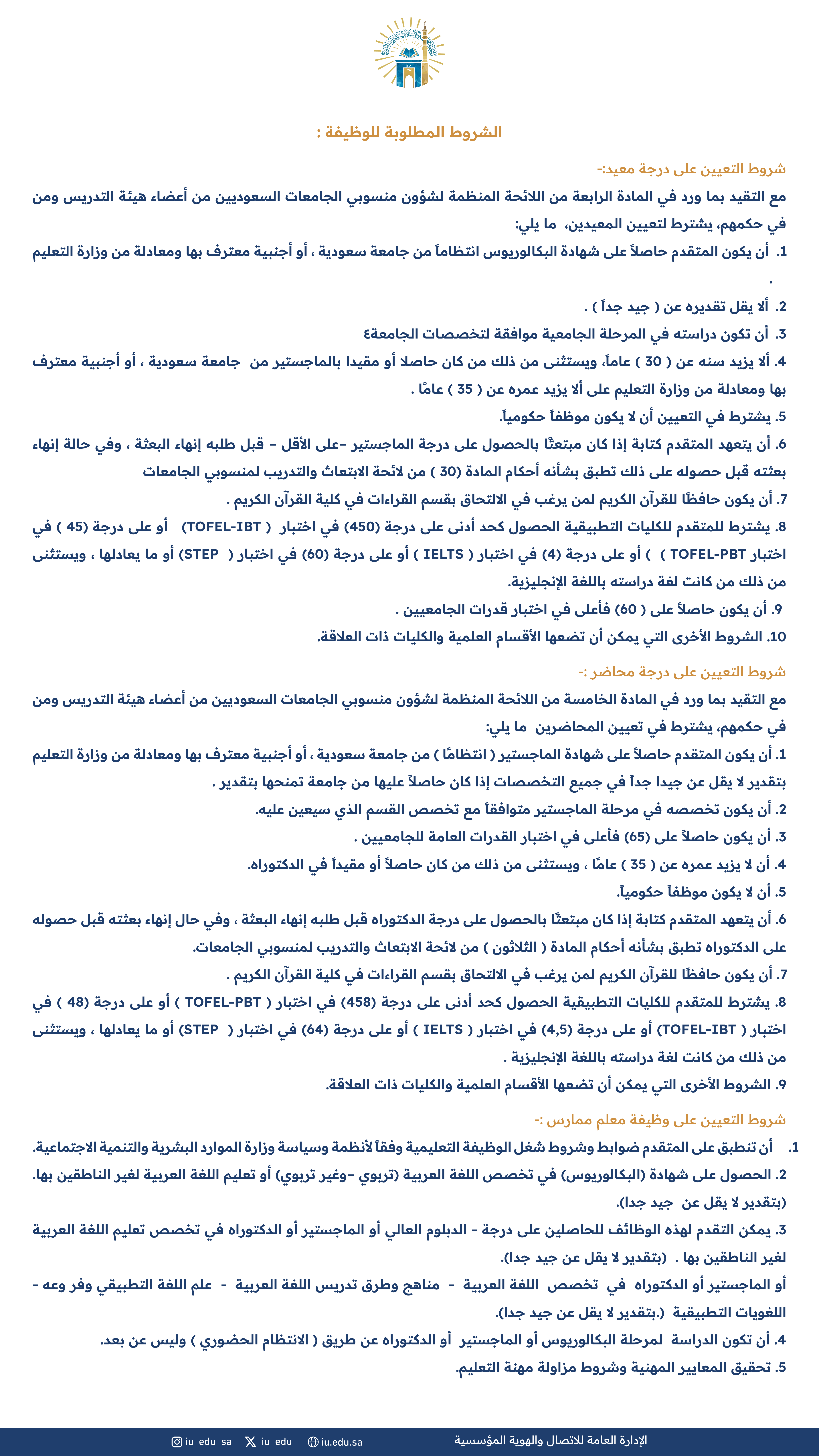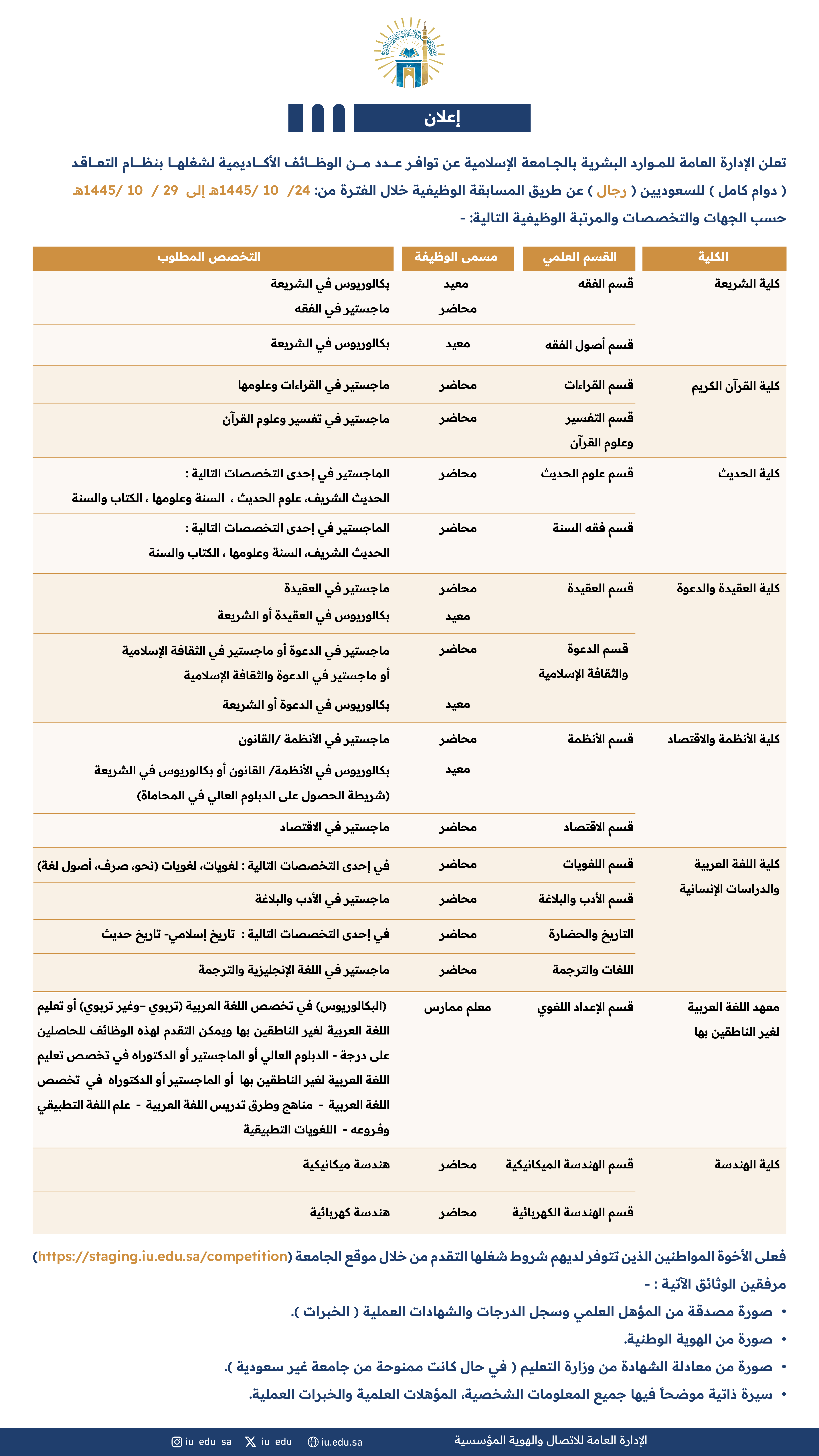 تعلن الجامعة الإسلامية عن توافر عدد من الوظائف الأكاديمية لشغلها بنظام التعاقد ( دوام كامل ) للسعوديين ( رجال )، عن طريق المسابقة الوظيفية، خلال الفترة من 24 شوال 1445هـ، حتى 29 شوال 1445هـ، حسب الجهات والتخصصات والمرتبة الوظيفية التالية.