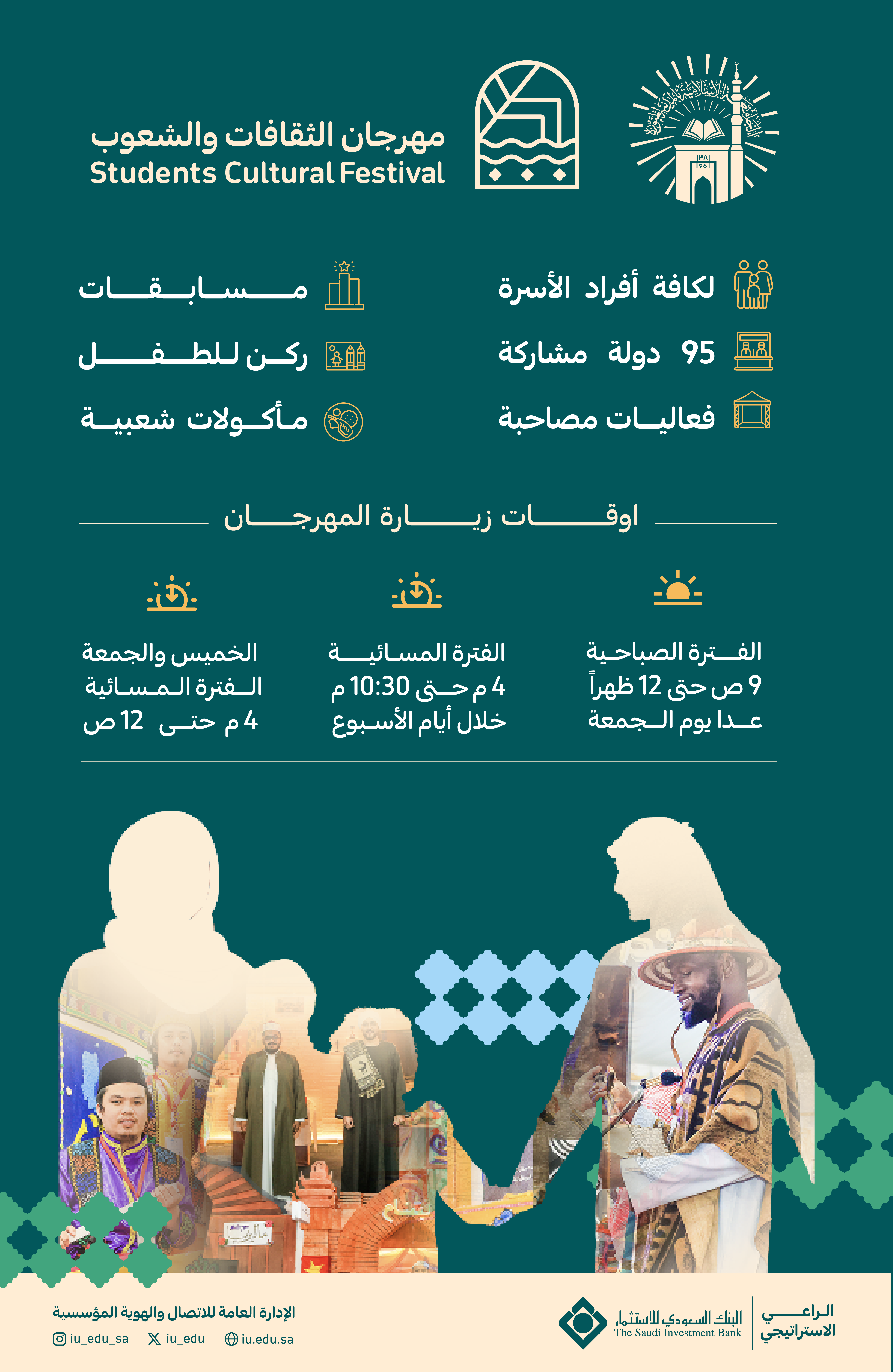 ترحب بكم الجامعة الاسلامية في مهرجان الثقافات والشعوب، بنسخته الثانية عشرة، خلال الفترة من 20 حتى 27 من شهر شوال 1445هـ.