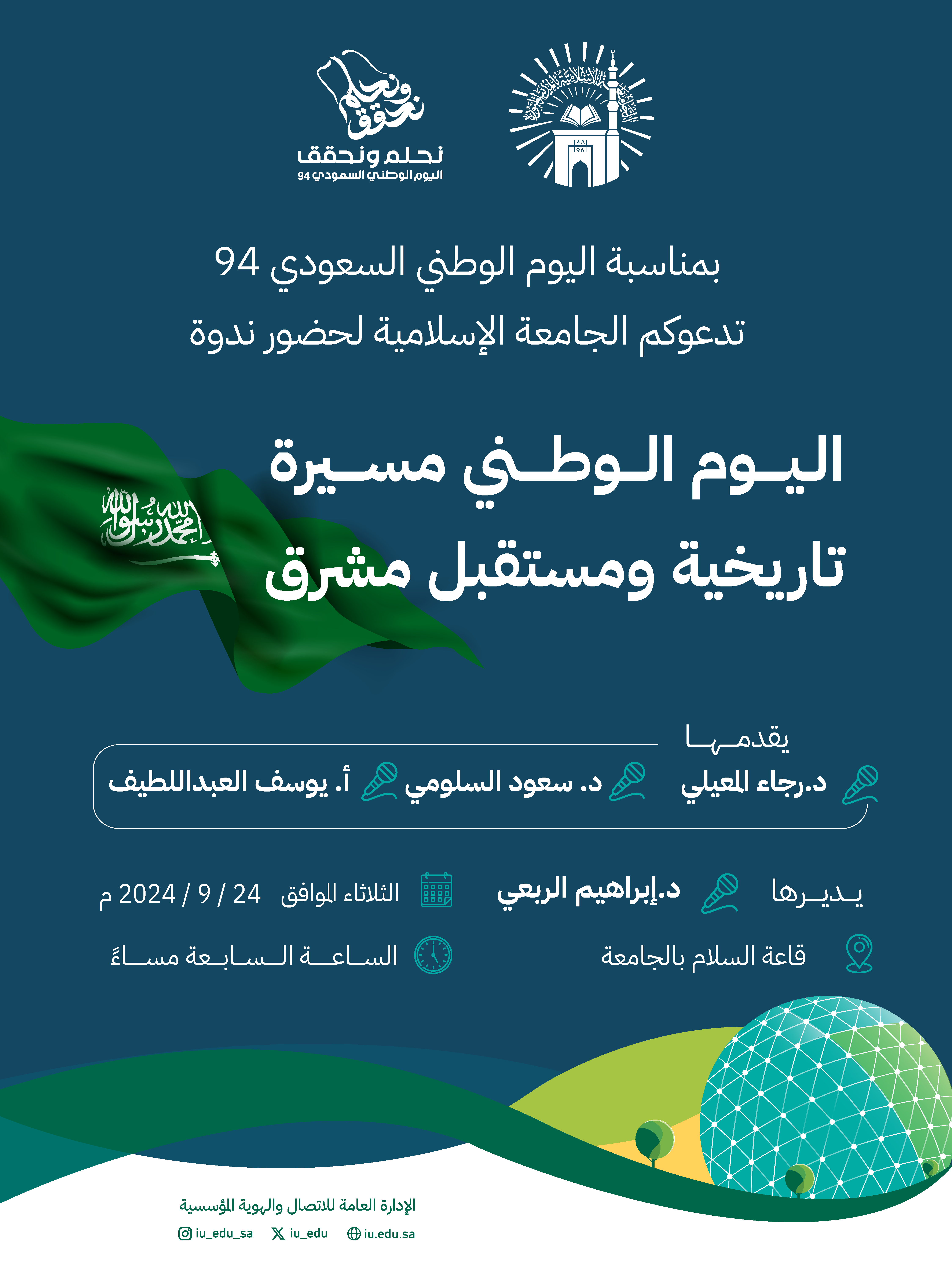 يسر الجامعة الإسلامية ممثلةً في كلية اللغة العربية والدراسات الإنسانية دعوتكم لحضور ندوة بعنوان: "اليوم الوطني مسيرة تاريخية ومستقبل مشرق"، استلهموا معنا قصة وطنٍ توحدت راياته على يد المؤسس -طيب الله ثراه- وازدهرت برؤية القيادة الرشيدة لتواصل مسيرة المجد والنماء.