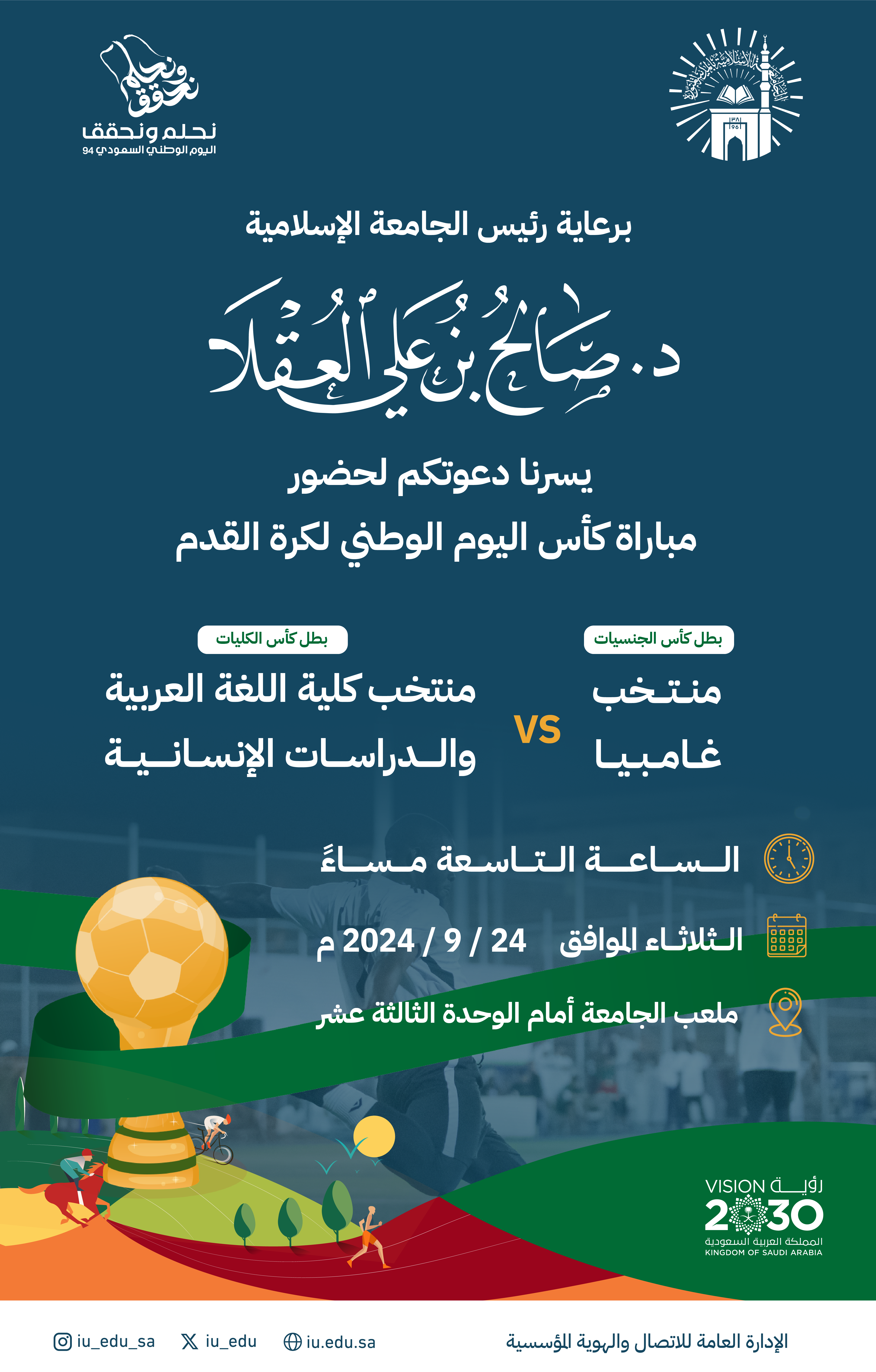 برعاية رئيس الجامعة الإسلامية د. صالح بن علي العقلا يسرنا دعوتكم لحضور مباراة كأس اليوم الوطني لكرة القدم.