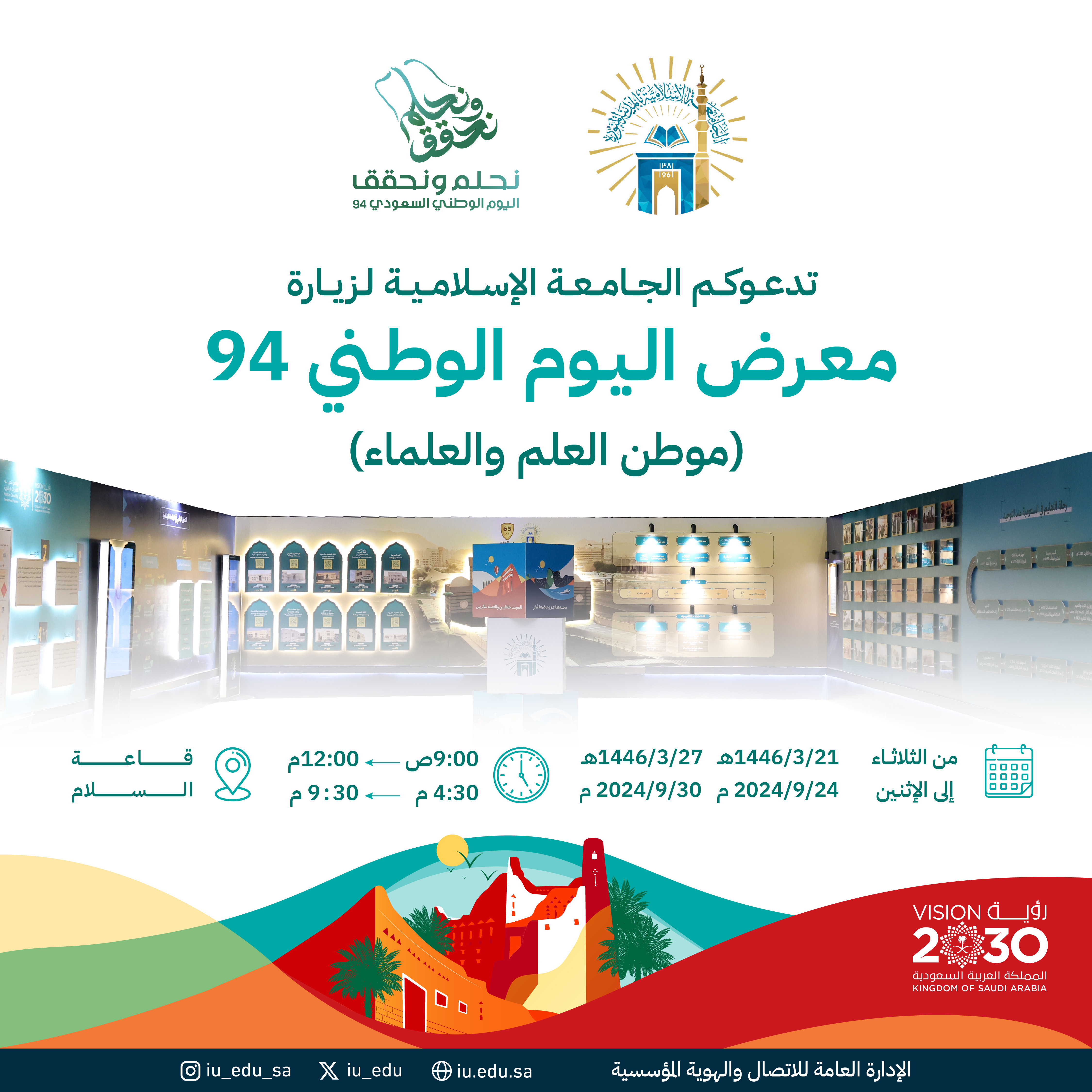 تدعوكم الجامعة الإسلامية لزيارة معرض اليوم الوطني94 "موطن العلم والعلماء"