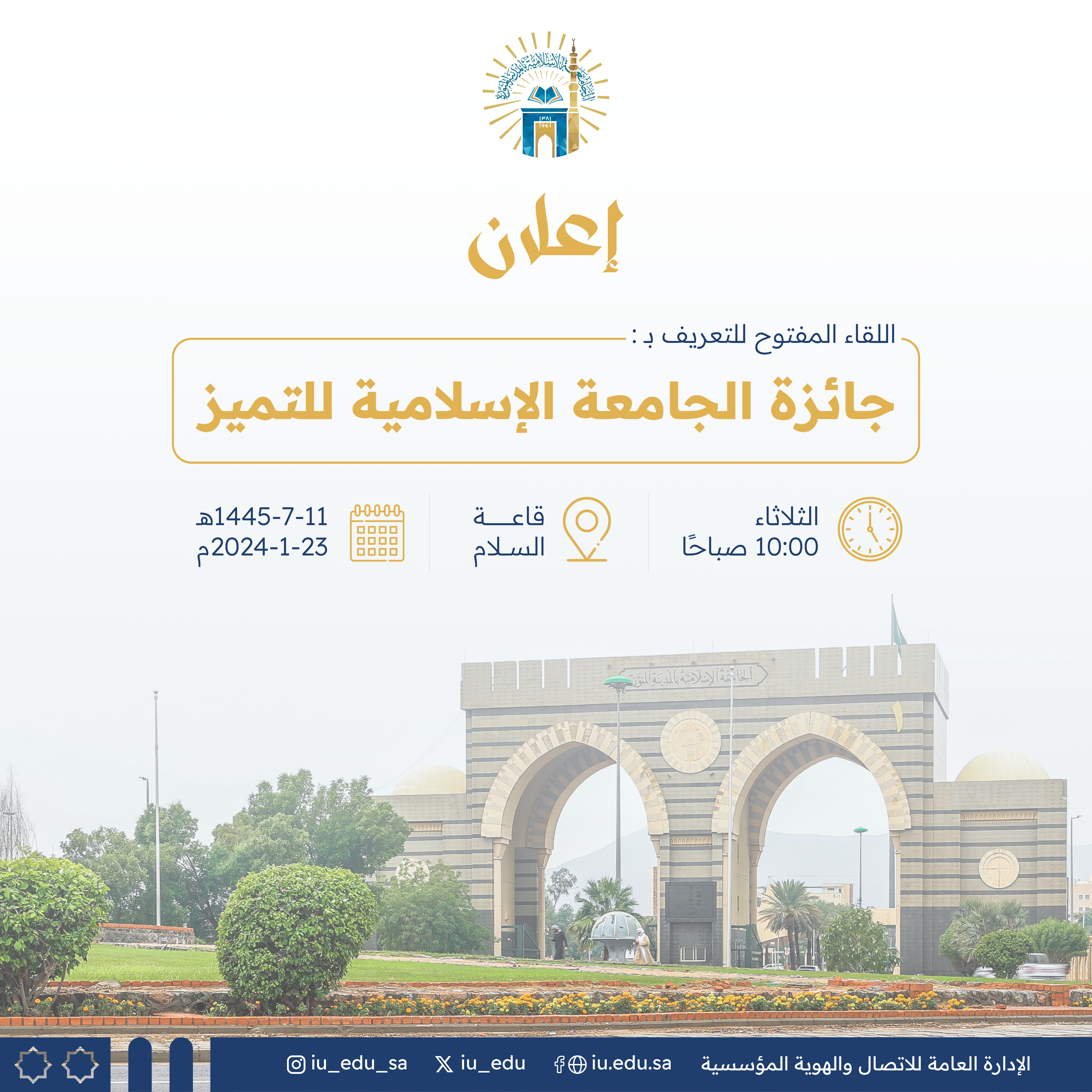إعلان اللقاء المفتوح للتعريف بجائزة الجامعة الإسلامية للتميز
