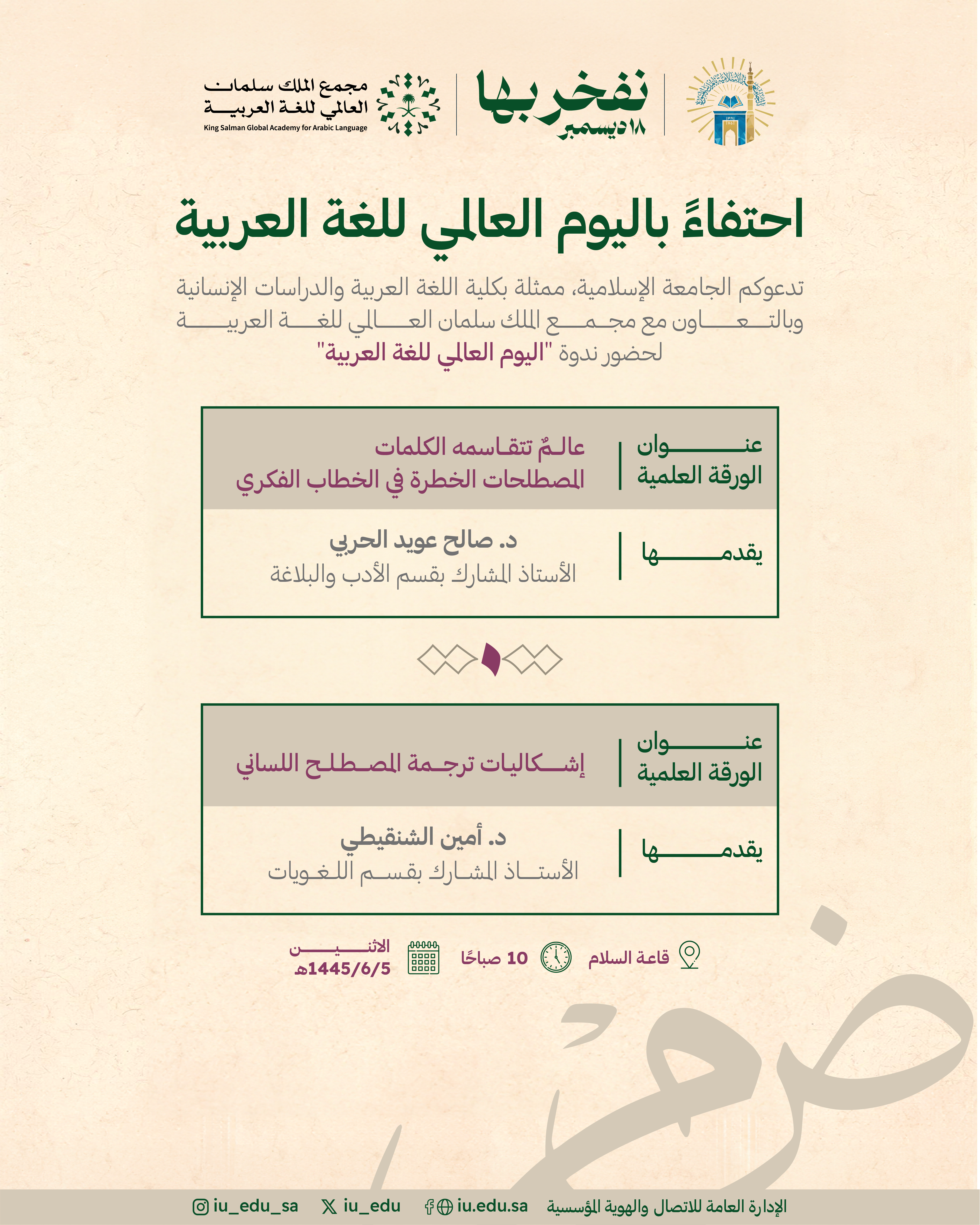 تدعوكم الجامعة الإسلامية لحضور ندوة: "اليوم العالمي للغة العربية"، يقدمها أعضاء هيئة التدريس بكلية اللغة العربية والدراسات الإنسانية.