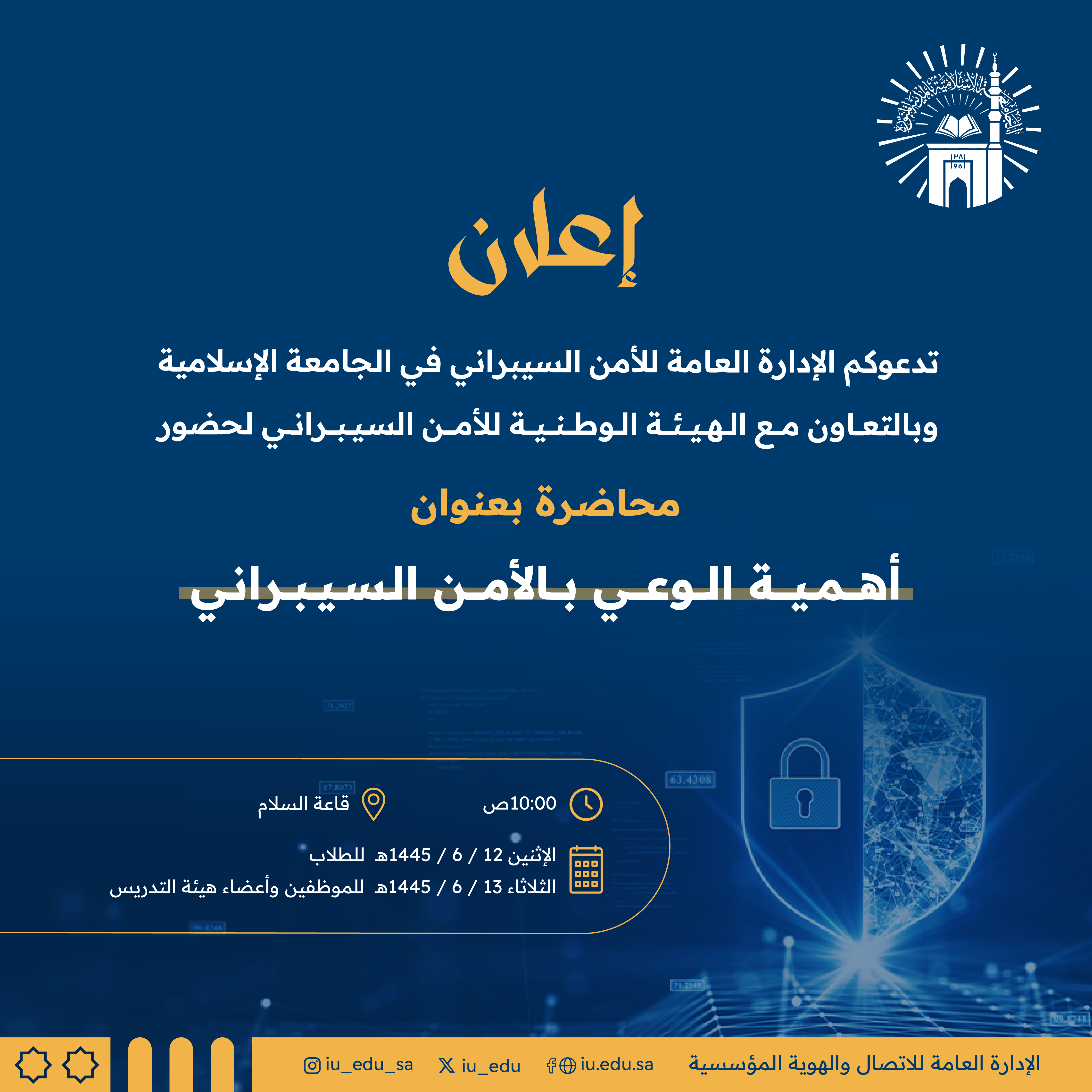 تدعوكم الجامعة الإسلامية لحضور محاضرة بعنوان: "أهمية الوعي بالأمن السيبراني" بالتعاون مع الهيئة الوطنية للأمن السيبراني