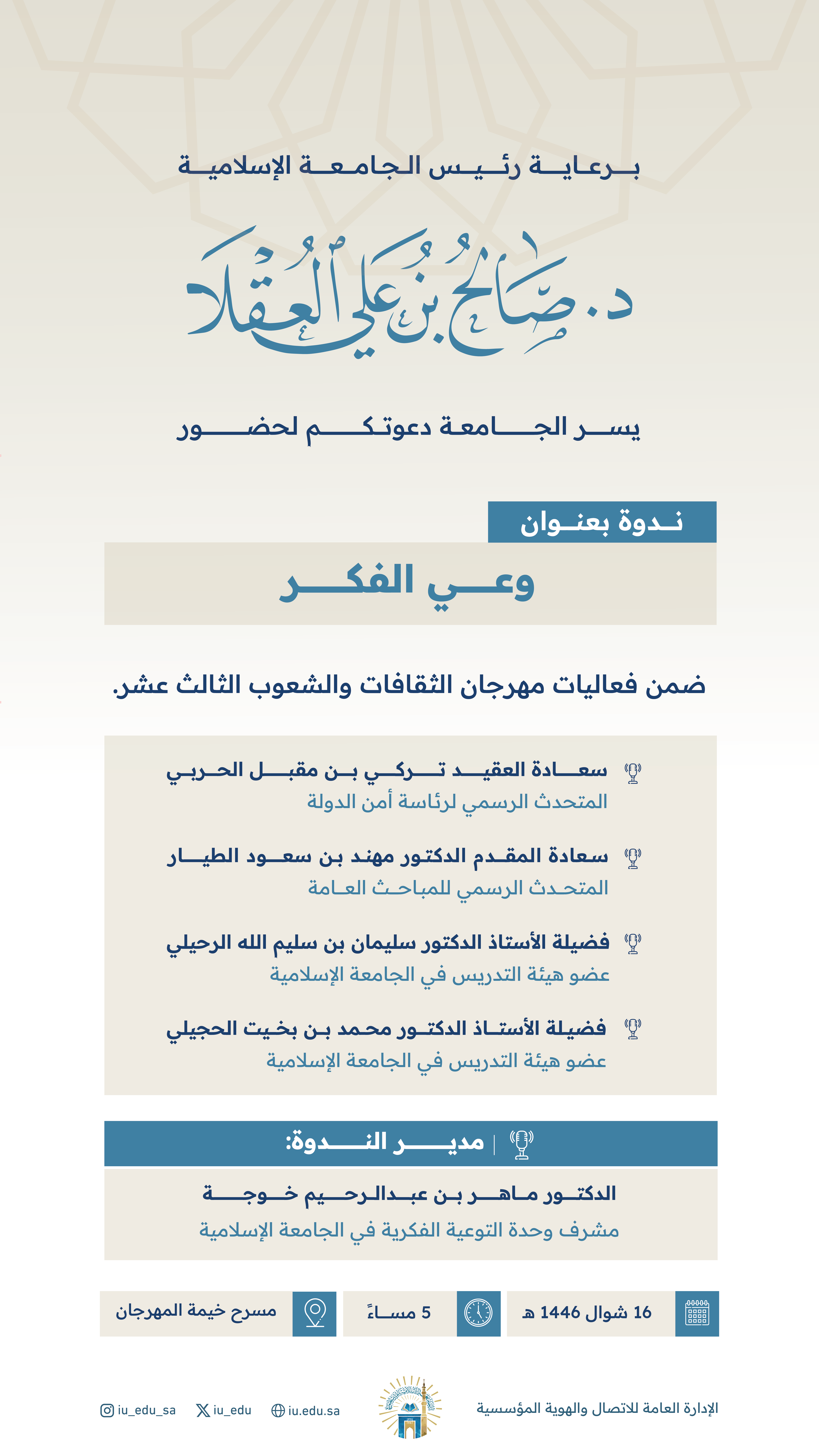 برعاية رئيس الجامعة الإسلامية يسر الجامعة دعوتكم لحضور ندوة بعنوان:"وعي الفكر" ضمن فعاليات مهرجان الثقافات والشعوب الثالث عشر.