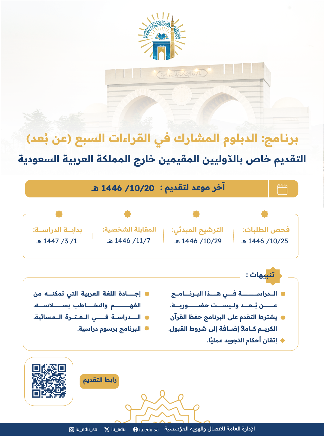تعلن الجامعة الإسلامية عن تمديد فترة القبول للتقديم على برنامج الدبلوم المشارك في القراءات السبع (عن بُعد)، حتى تاريخ: 20/ 10/ 1446هـ.