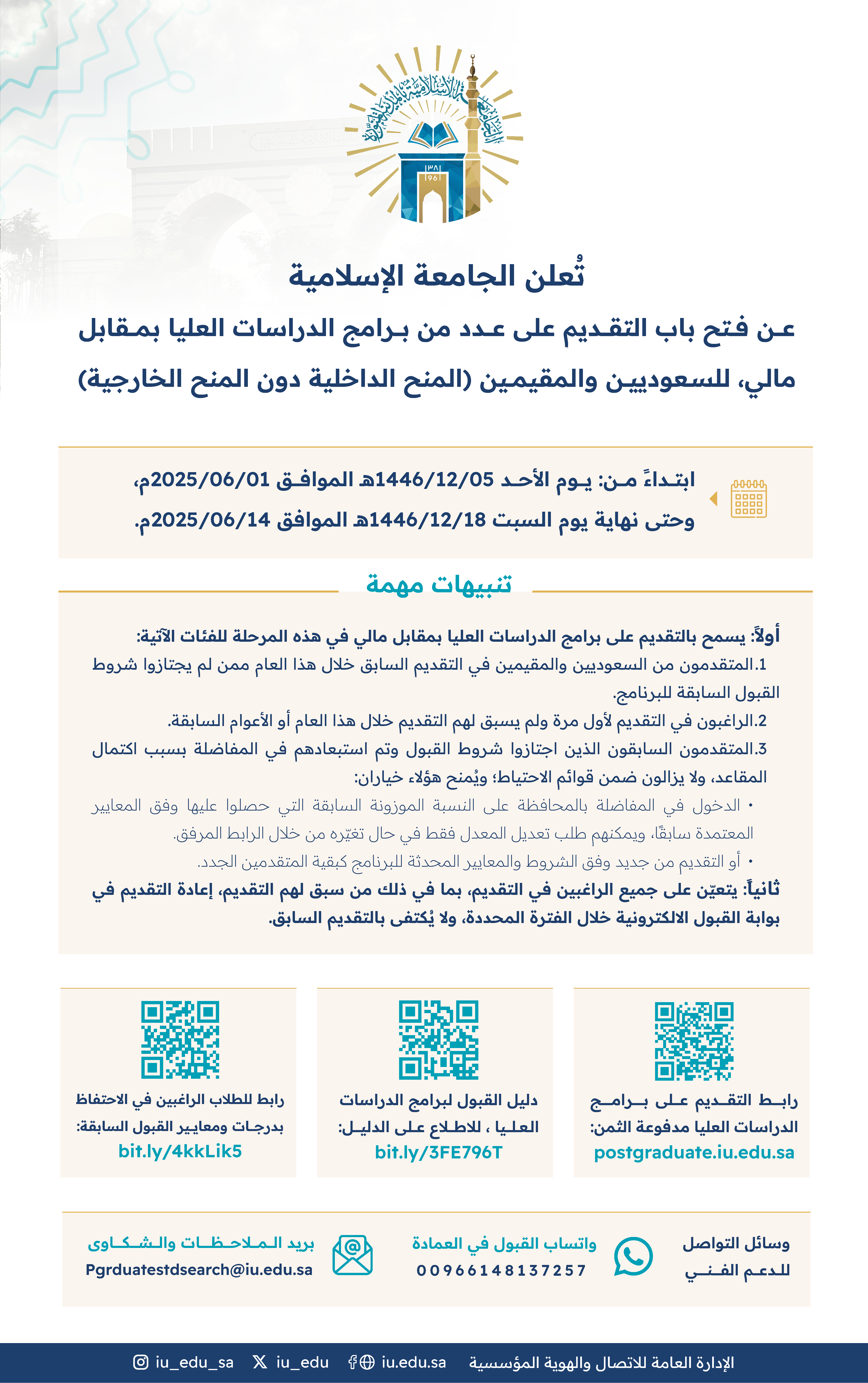 للتقديم عبر الرابط الآتي:https://bit.ly/postgraduateIU