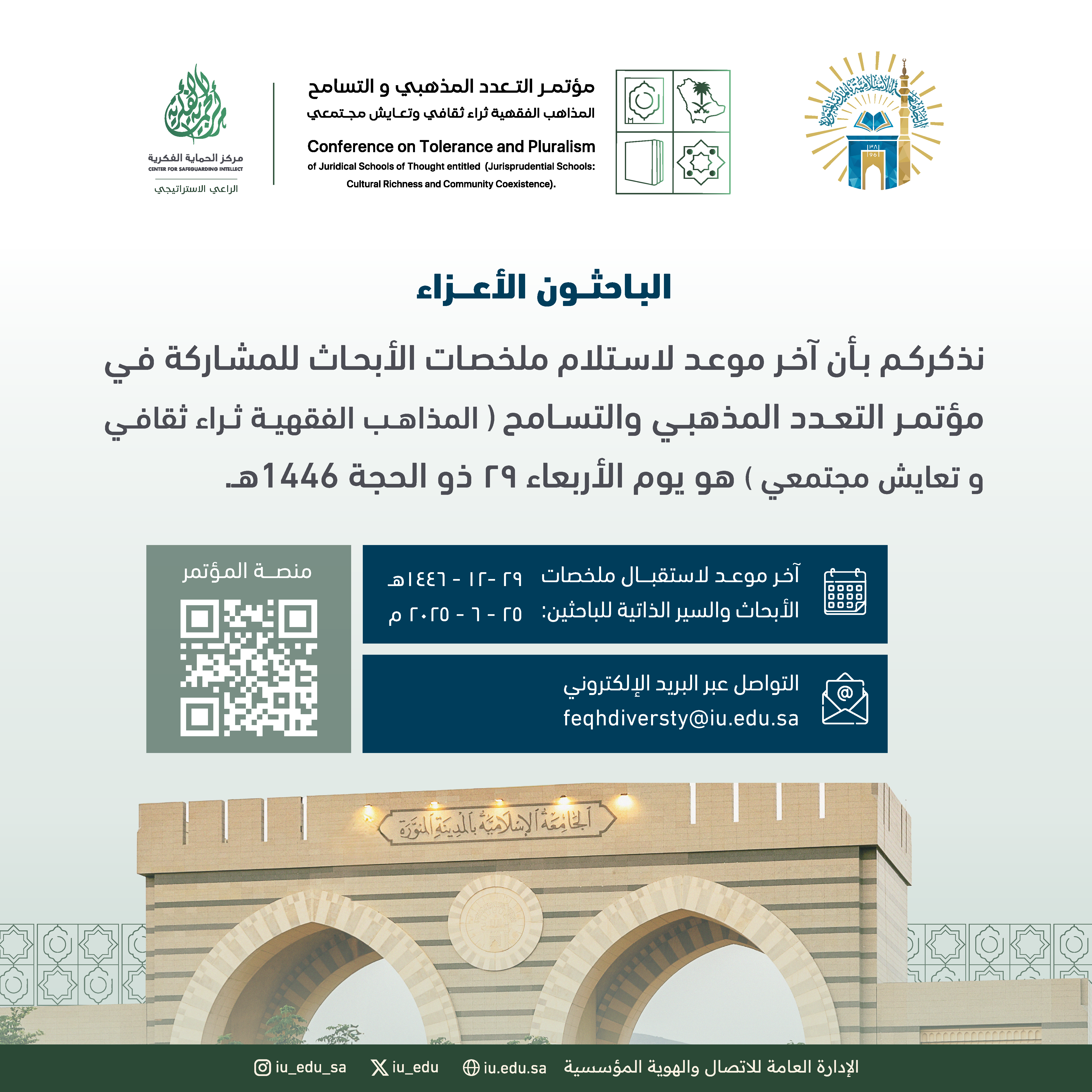 نذكركم بأن آخر موعد لاستلام ملخصات الأبحاث للمشاركة في مؤتمر التعدد المذهبي والتسامح: المذاهب الفقهية ثراء ثقافي وتعايش مجتمعي، هو يوم الأربعاء 29 ذو الحجة 1446هـ.للتسجيل عبر الرابط الآتي: https://bit.ly/shariahIU