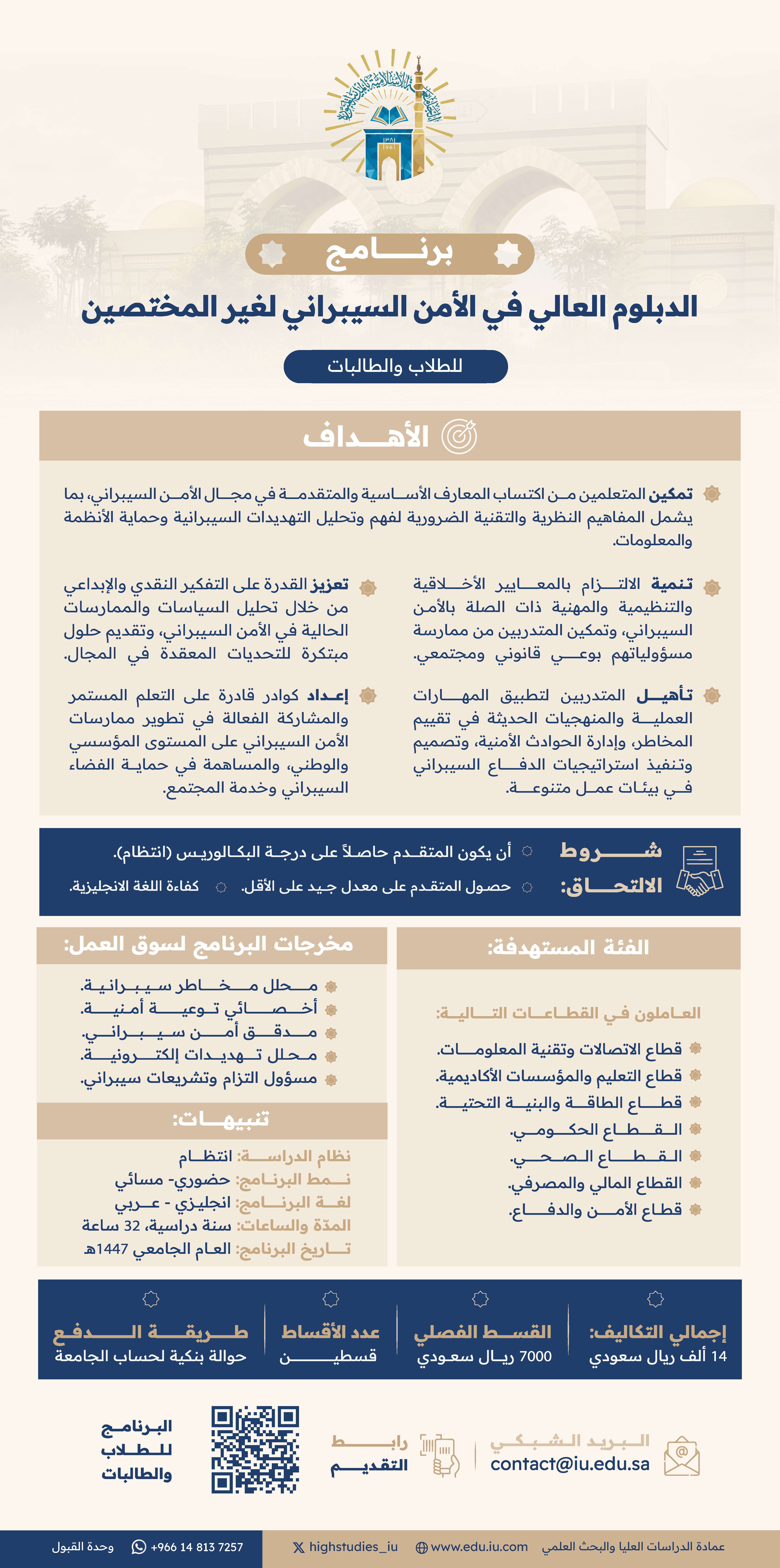 تُعلن الجامعة الإسلامية، عن تمديد فترة التقديم على برنامج الدبلوم العالي في الأمن السيبراني (للطلاب والطالبات) حتى 20 محرم 1447هـ؛ لإتاحة الفرصة للراغبين في التقديم على البرنامج.
