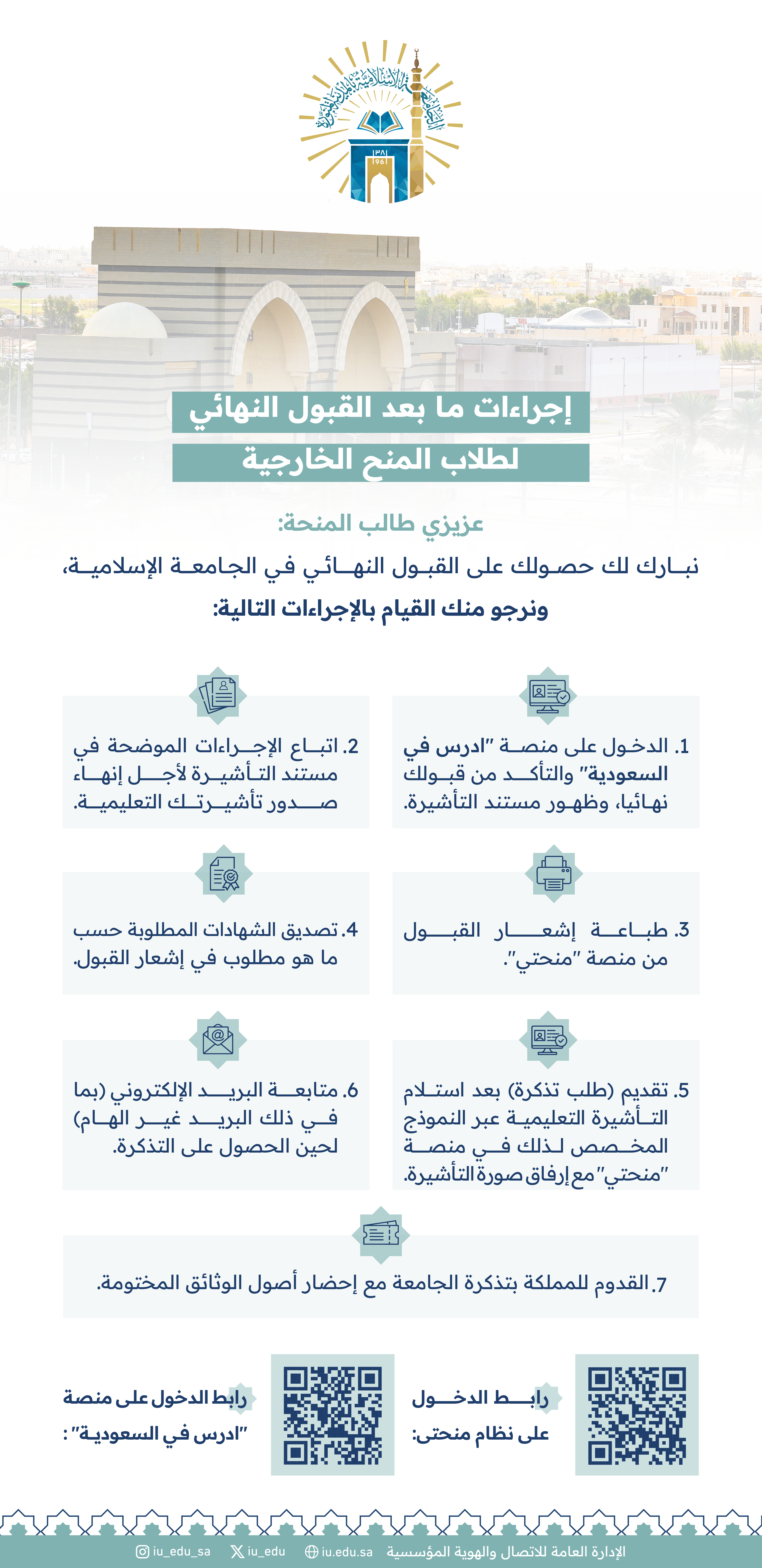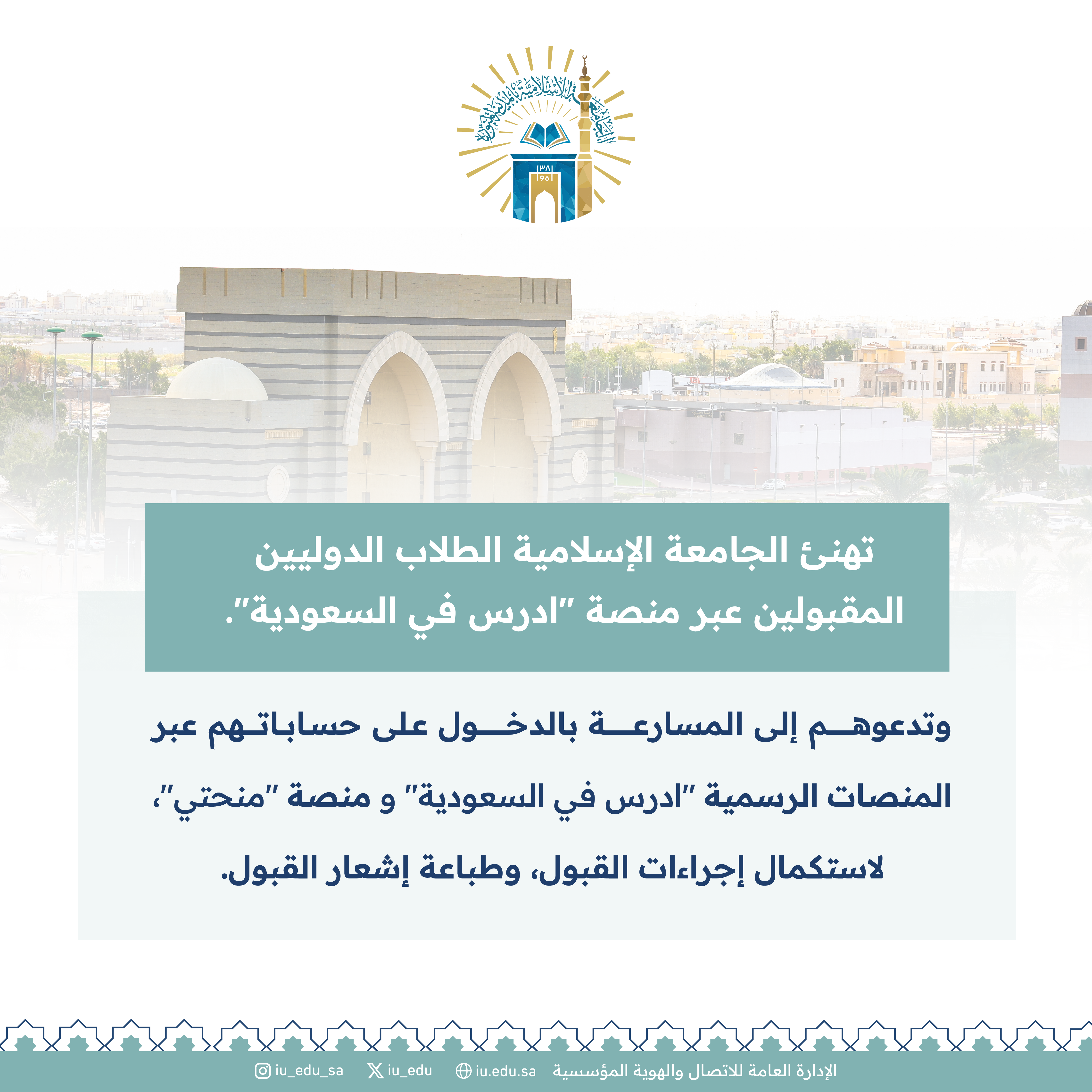 تهنئ الجامعة الإسلامية الطلاب الدوليين، المقبولين نهائياً عبر منصة "ادرس في السعودية"، وتؤكد ضرورة الدخول إلى حساباتهم بالمنصة؛ لاستكمال إجراءات التأشيرة التعليمية.