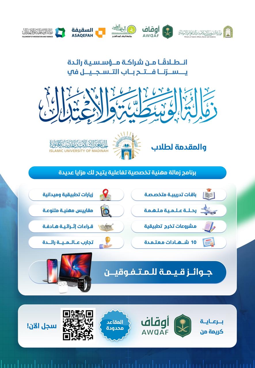 انطلاقاً من رؤية السعودية 2030 في تعزيز قيم الوسطية والاعتدال، وبشراكة مؤسسية رائدة يسرنا الإعلان عن فتح باب التسجيل في "زمالة الوسطية والاعتدال"، والمقدمة لطلاب الجامعة الإسلامية بالمدينة المنورة.