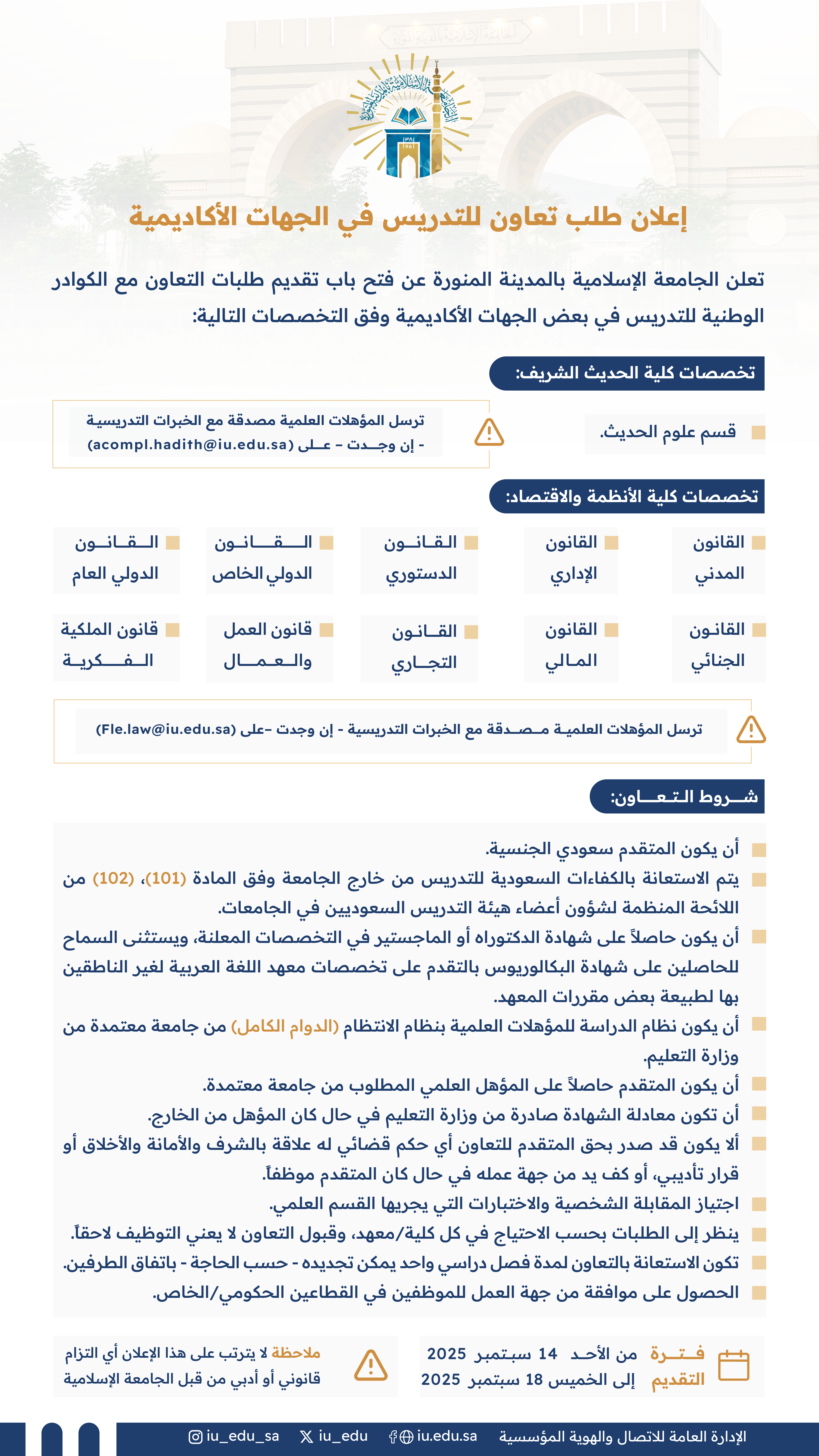 تعلن الإدارة العامة للموارد البشرية في الجامعة الإسلامية بالمدينة المنورة، عن فتح باب تقديم طلبات التعاون بنظام الساعات مع الكوادر الوطنية (رجال)، للتدريس في بعض الجهات الأكاديمية وفق التخصصات الموضحة.