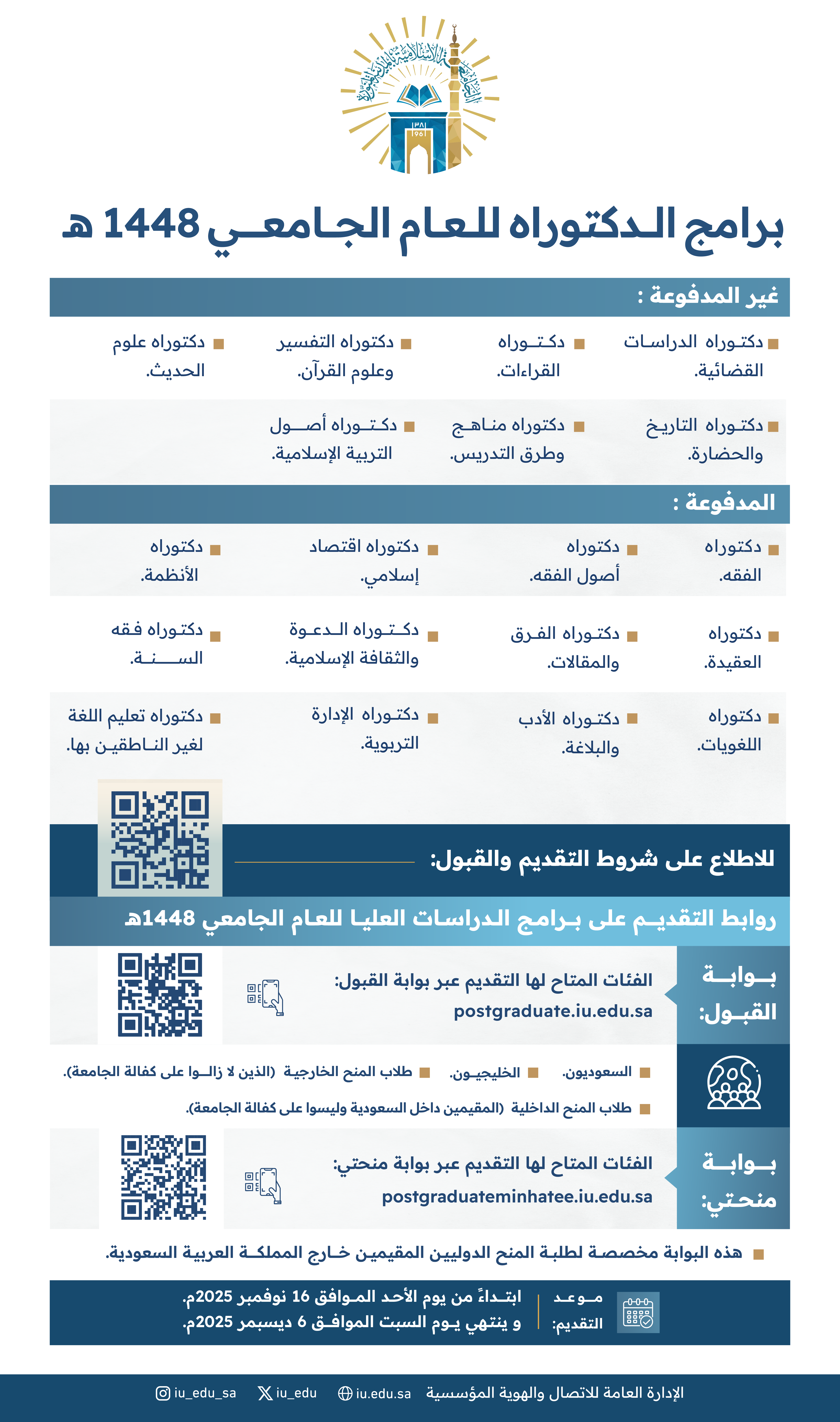 تعرّف على برامج الدراسات العليا (الدكتوراه) المدفوعة وغير المدفوعة للعام الجامعي 1448هـ في الجامعة الإسلامية.