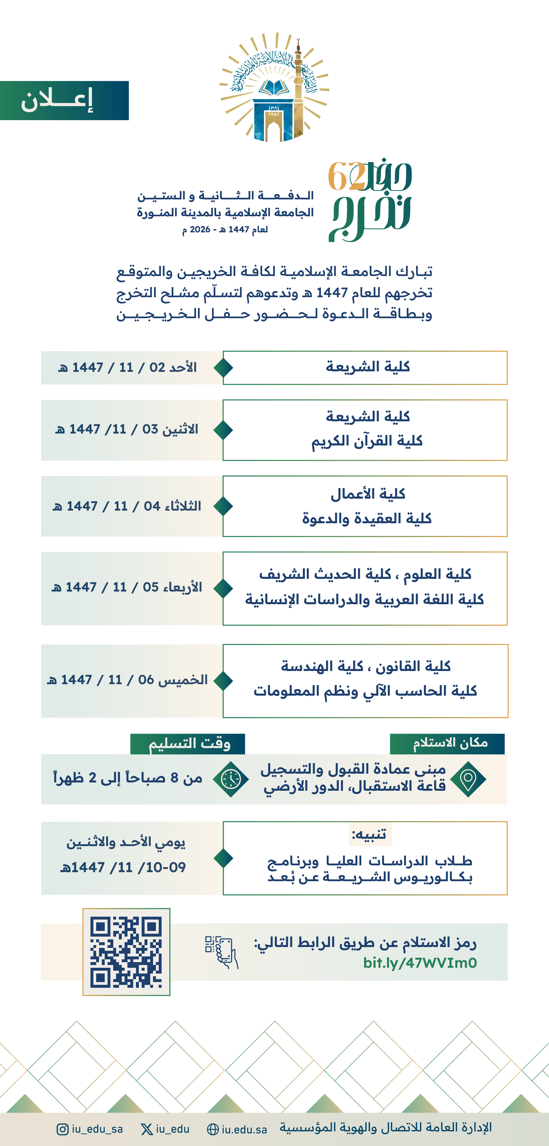 دعوة للخريجين والمتوقع تخرجهم للعام الجامعي 1447هـ - 2026م، لتسلّم مشلح التخرج، ووشاح التخرج، وبطاقة الدعوة لحضور حفل تخرج الدفعة 62
