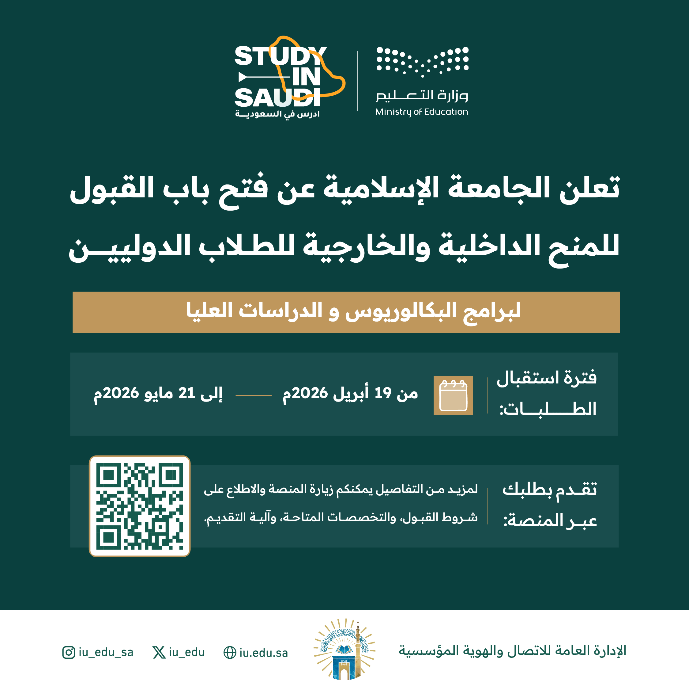 الجامعة الإسلامية تدعو الطلاب الراغبين في الالتحاق ببرامجها الأكاديمية من مختلف دول العالم إلى التقديم عبر منصة ادرس في السعودية، وذلك للمنح الداخلية والخارجية، ضمن مسارات تعليمية نوعية تسهم في تأهيلهم علميًا ومعرفيًا؛ ليكونوا عناصرًا فاعلةً في خدمة مجتمعاتهم.