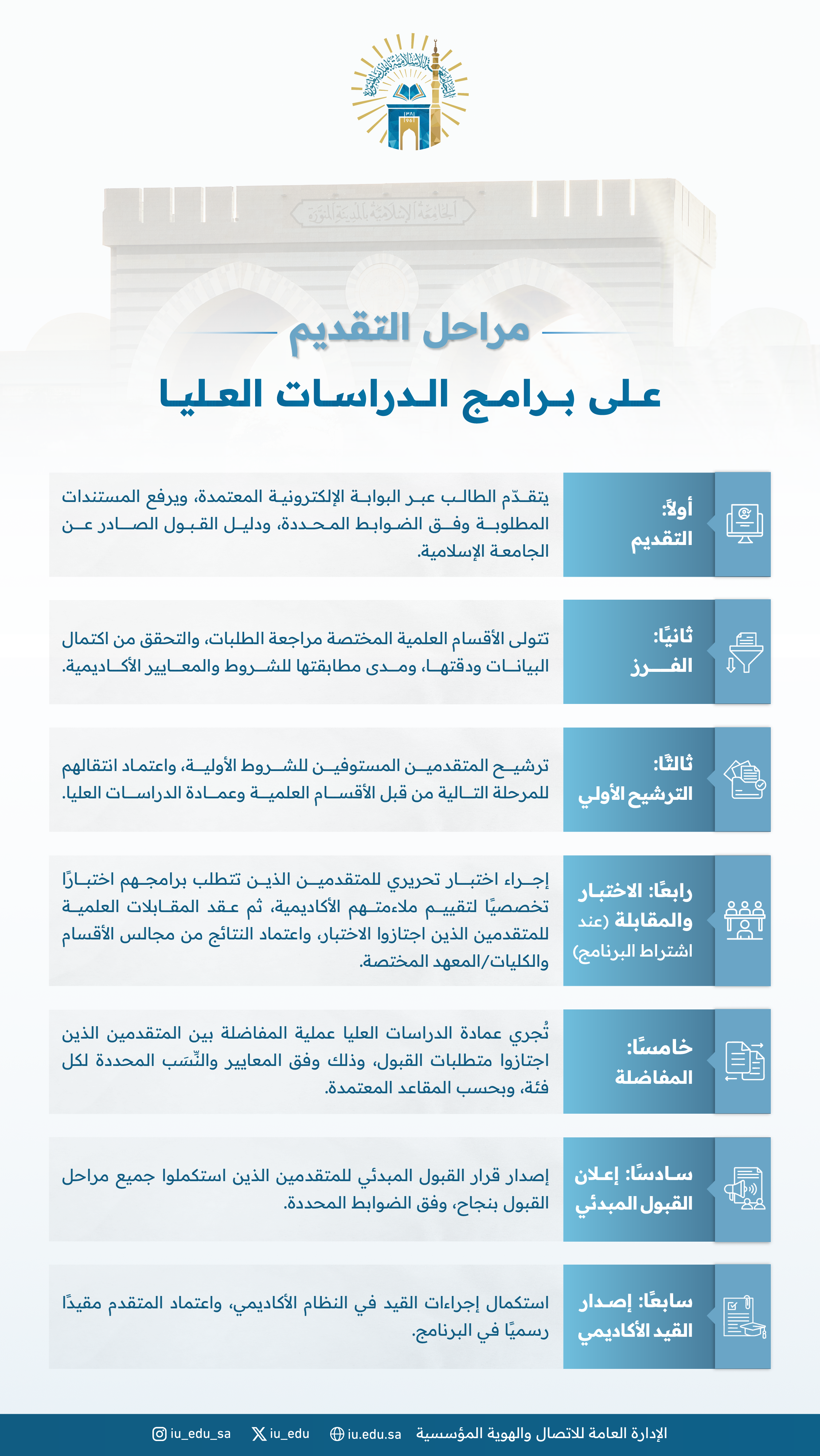 مراحل التقديم على برامج الدراسات العليا بالجامعة الإسلامية.