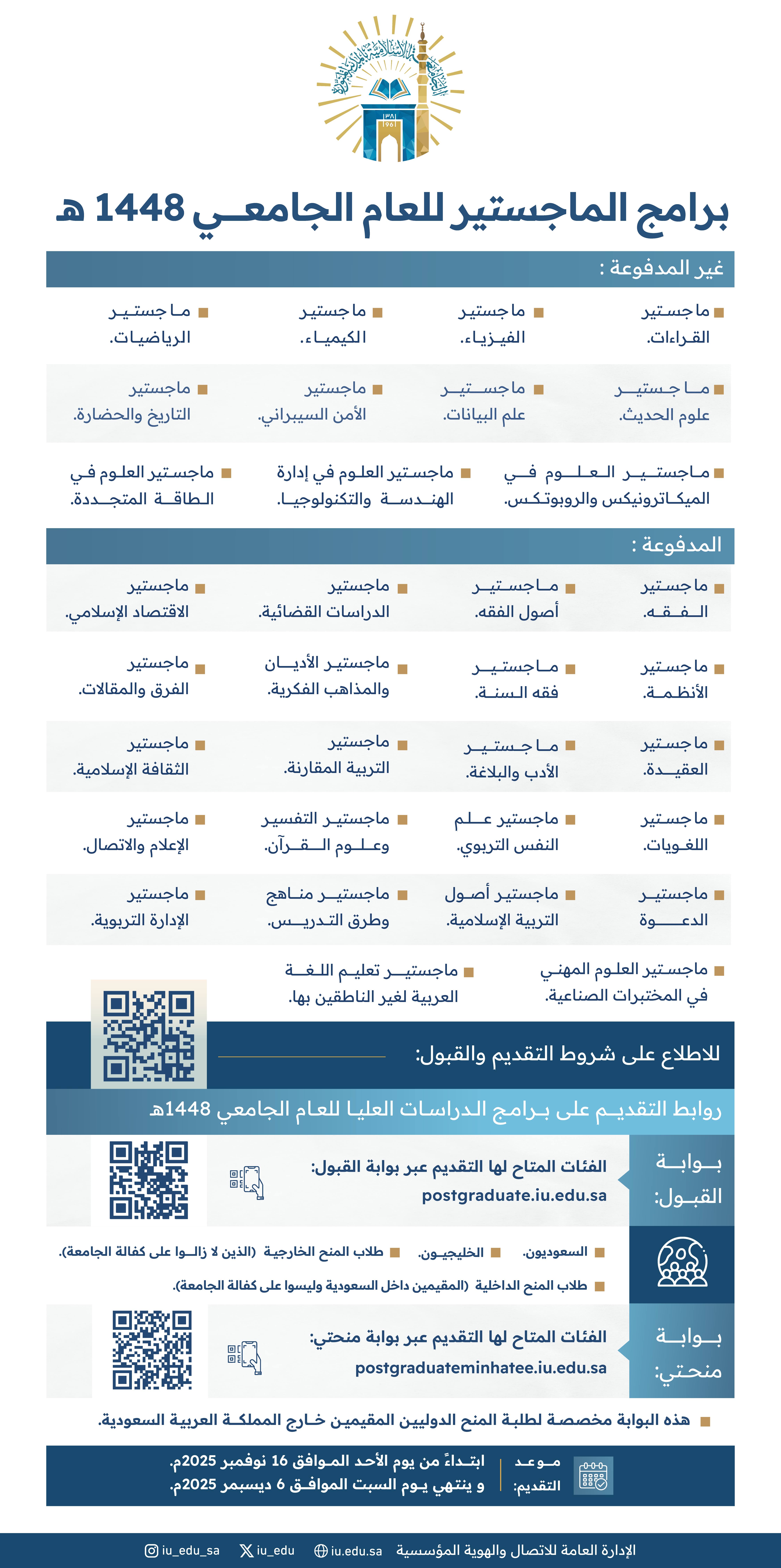 تعرّف على برامج الدراسات العليا (الماجستير) المدفوعة وغير المدفوعة للعام الجامعي 1448هـ في الجامعة الإسلامية