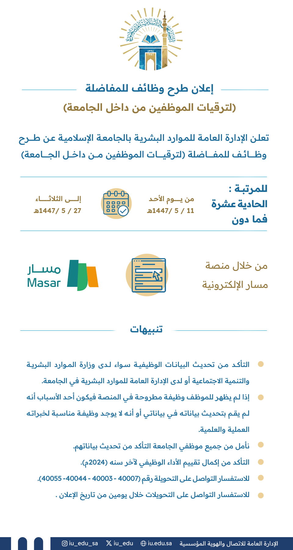 تعلن الإدارة العامة للموارد البشرية بالجامعة الإسلامية عن طرح وظائف للمفاضلة؛ لترقيات الموظفين من داخل الجامعة.
