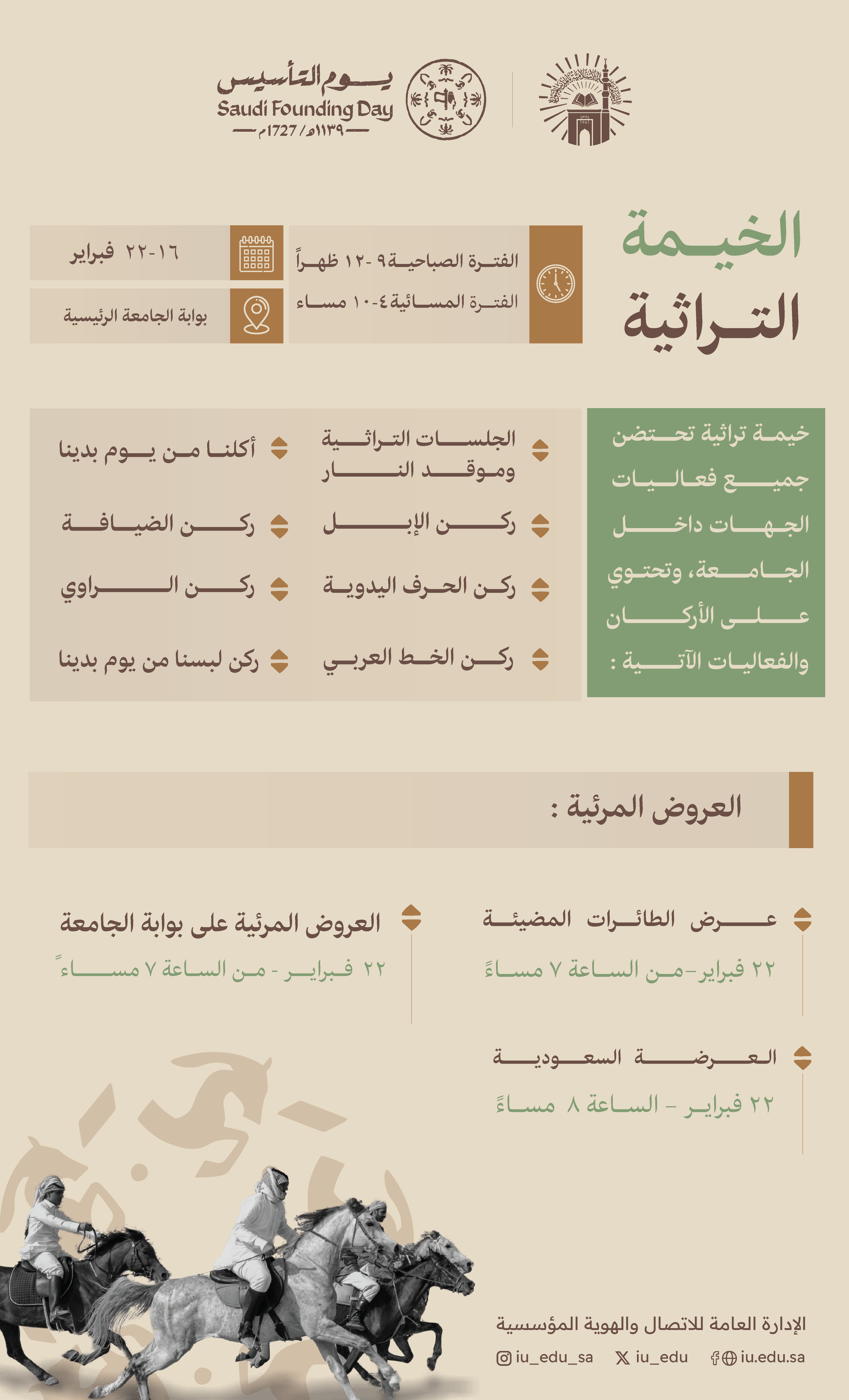 احتفاءً بيوم التأسيس؛ يسر الجامعةالإسلامية دعوتكم لزيارة الخيمة التراثية، والمشاركة في فعالياتها، ومشاهدة العروض المتنوعة.