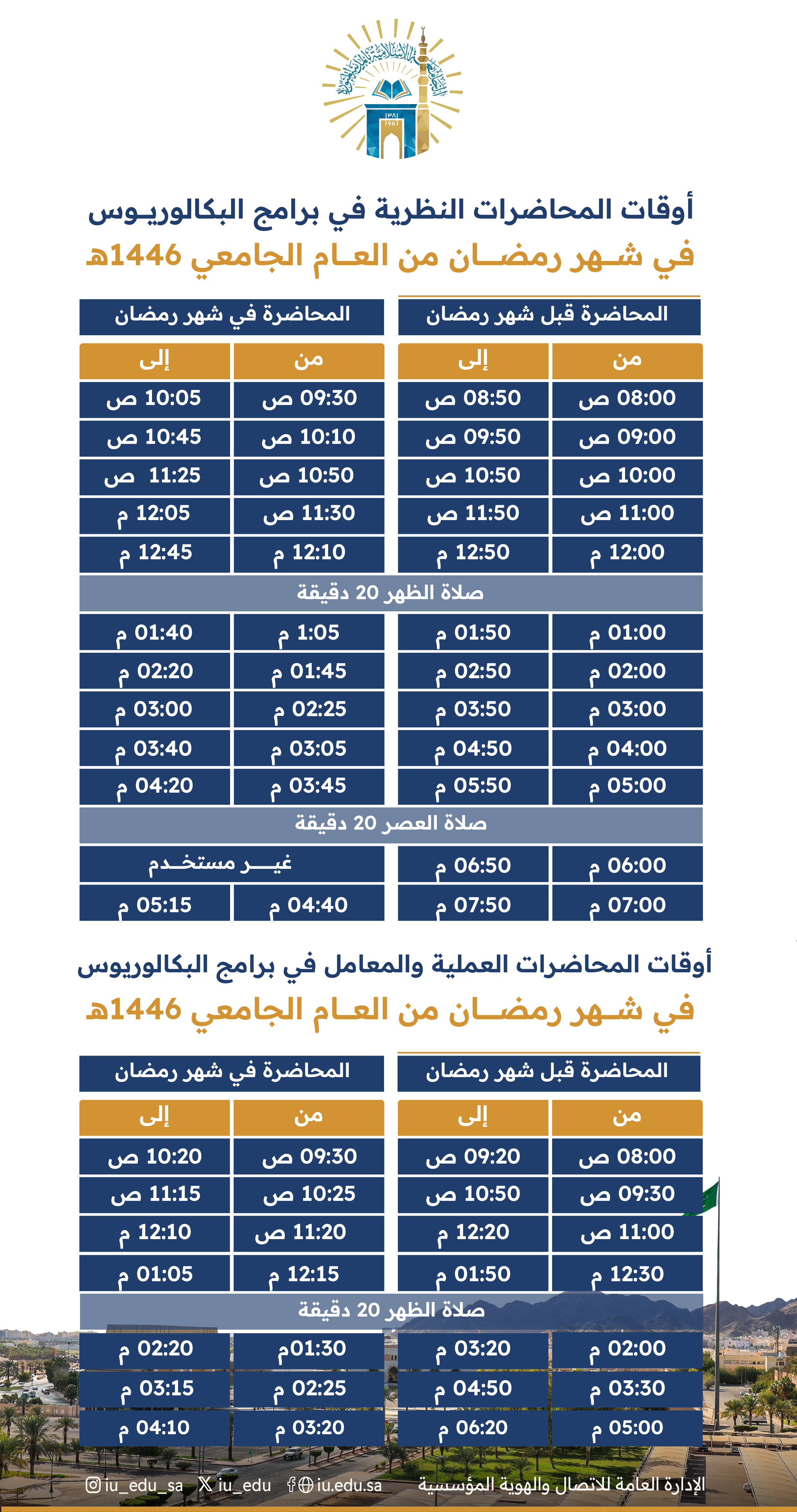 أوقات المحاضرات النظرية والعلمية والمعامل في برامج البكالوريوس (الانتظام) في شهر رمضان المبارك من العام 1446هـ.