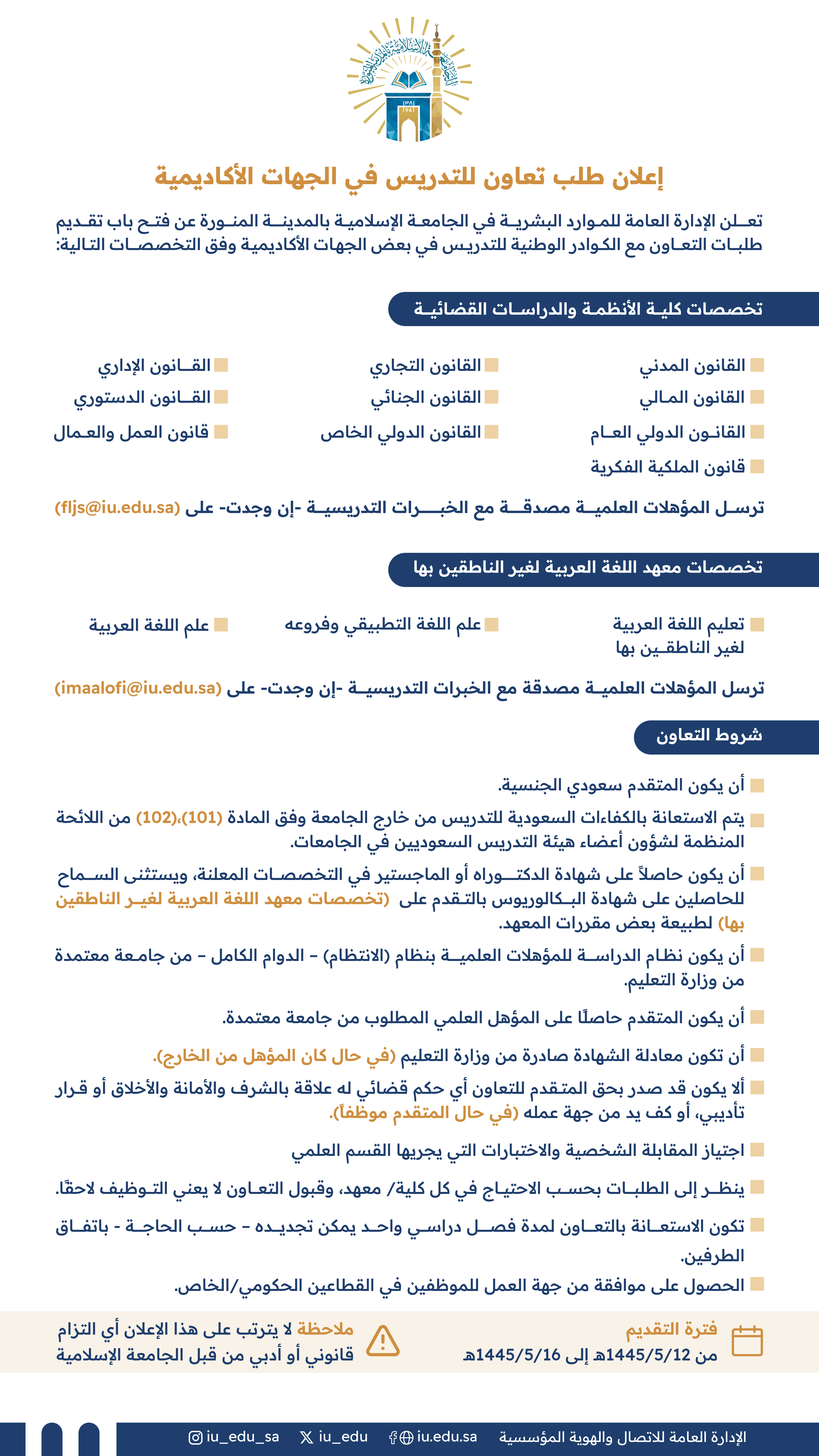 تعلن الجامعة الإسلامية عن فتح باب التقديم لطلبات التعاون مع الكوادر الوطنية، للتدريس في الجهات الأكاديمية وفق التخصصات والشروط التالية
