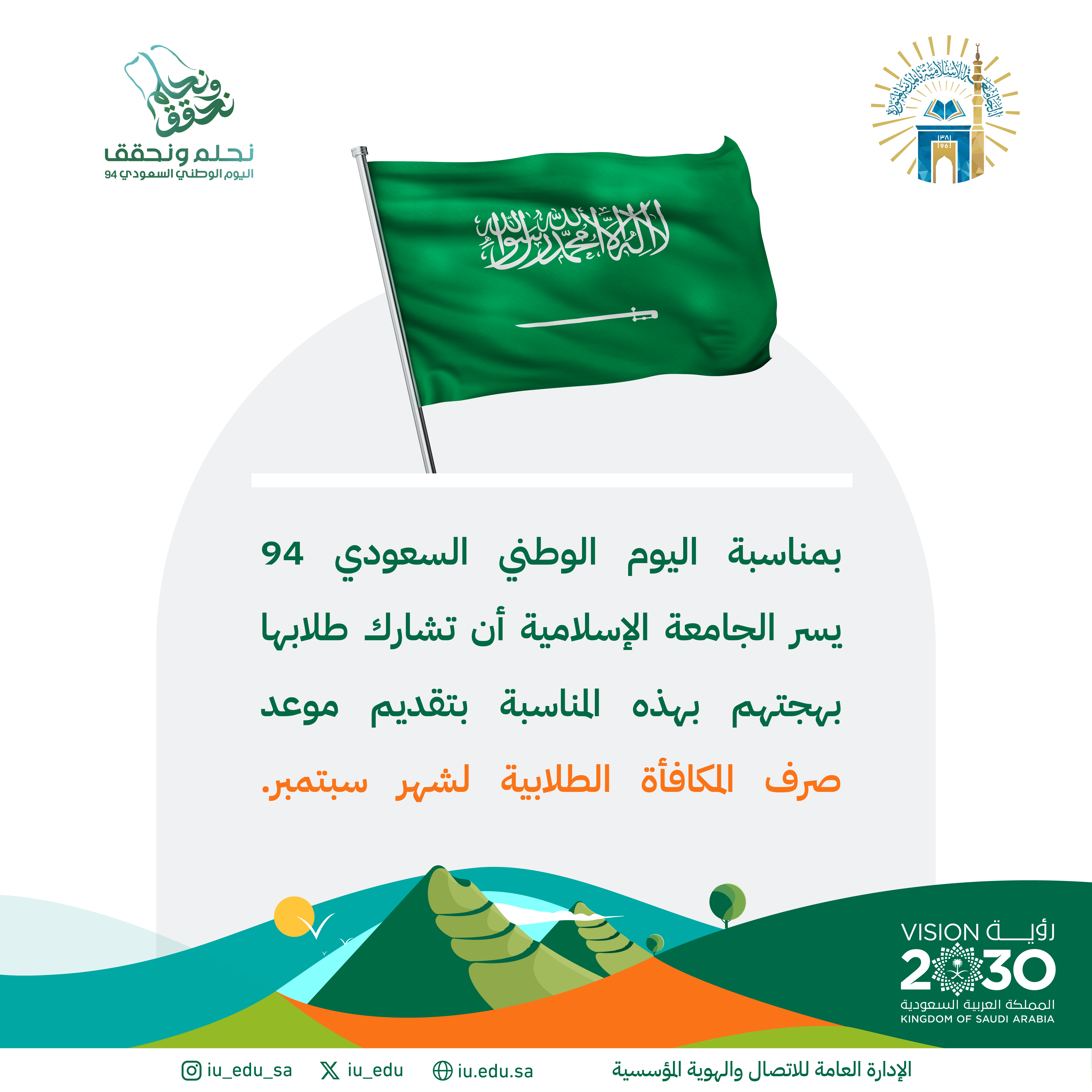 بمناسبة اليوم الوطني السعودي يسر الجامعة الإسلامية أن تشارك طلابها بهجتهم، بصرف المكافأة الطلابية لشهر سبتمبر هذا المساء