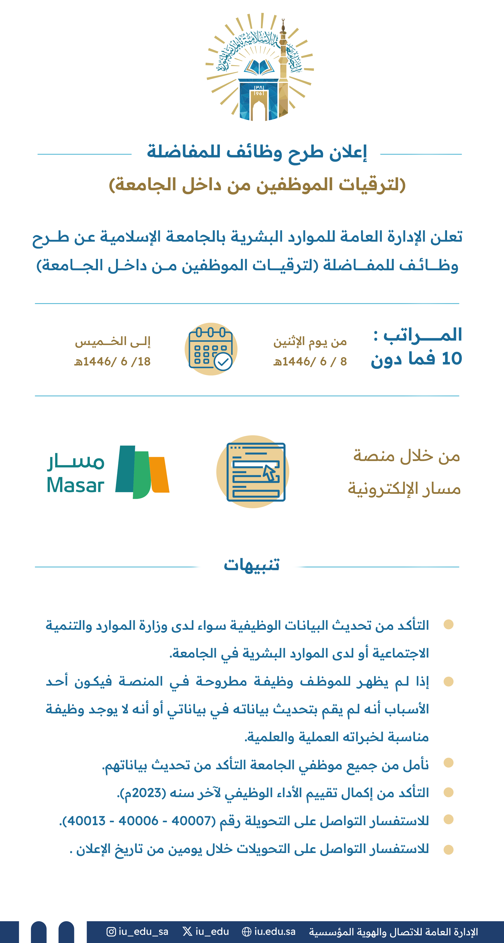 تعلن الإدارة العامة للموارد البشرية بـ الجامعة الإسلامية عن طرح وظائف للمفاضلة؛ لترقيات الموظفين من داخل الجامعة، وذلك للمرتبة العاشرة وما دونها.