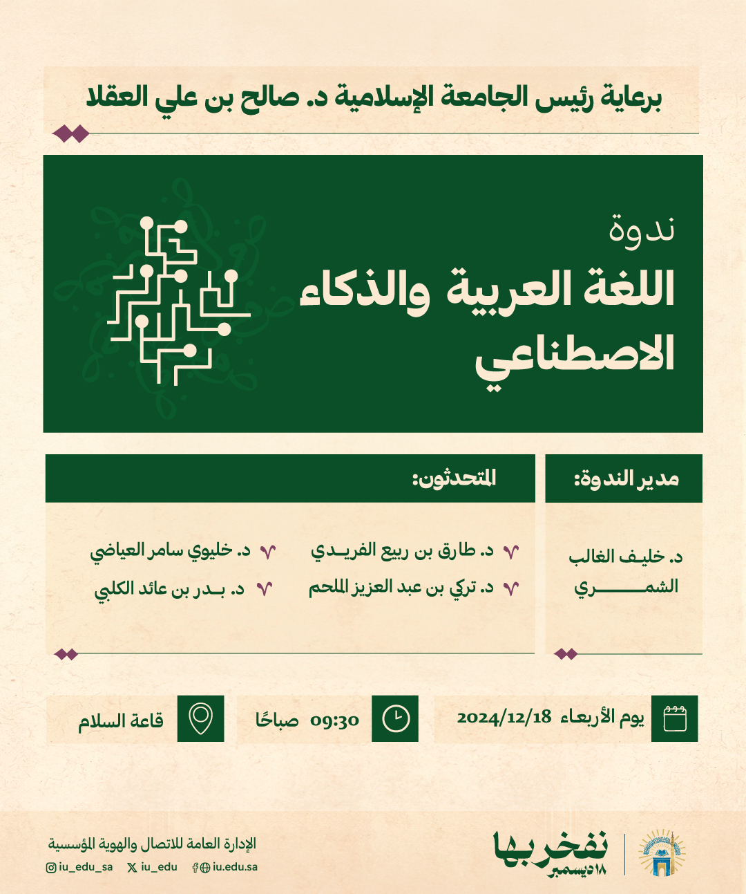 برعاية رئيس الجامعة الإسلامية د.صالح بن علي العقلا. تنظم الجامعة ندوةً علميةً بعنوان: "اللغة العربية و الذكاء الإصطناعي"؛ وذلك تزامناً مع اليوم العالمي للغة العربية.