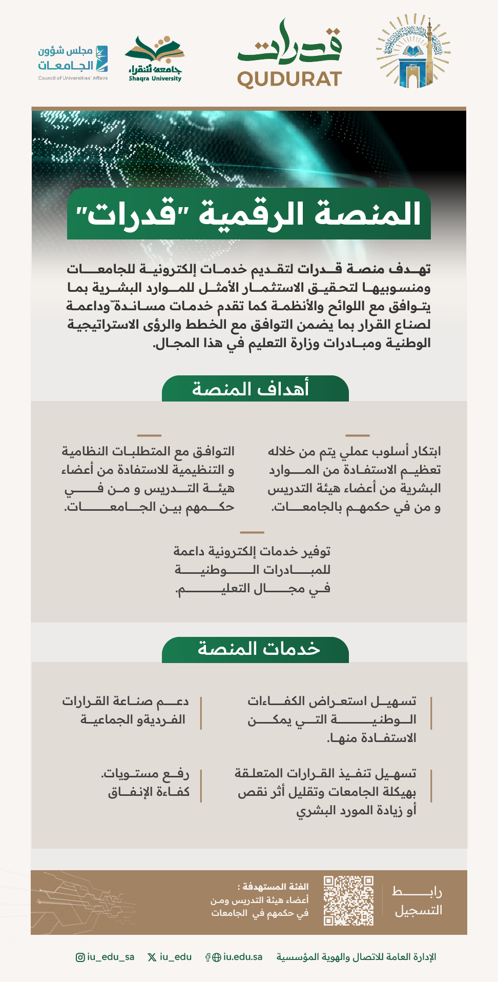 منصة قدرات الرقمية تمثّل حلقة وصل بين الخبرات الأكاديمية في الجامعات السعودية، والفرص التنموية في القطاعين العام والخاص؛ بهدف تحقيق التكامل، وتعزيز التعاون بين هذه القطاعات، مع التركيز على استثمار الكفاءات الأكاديمية الوطنية؛ لتحقيق التنمية المستدامة.