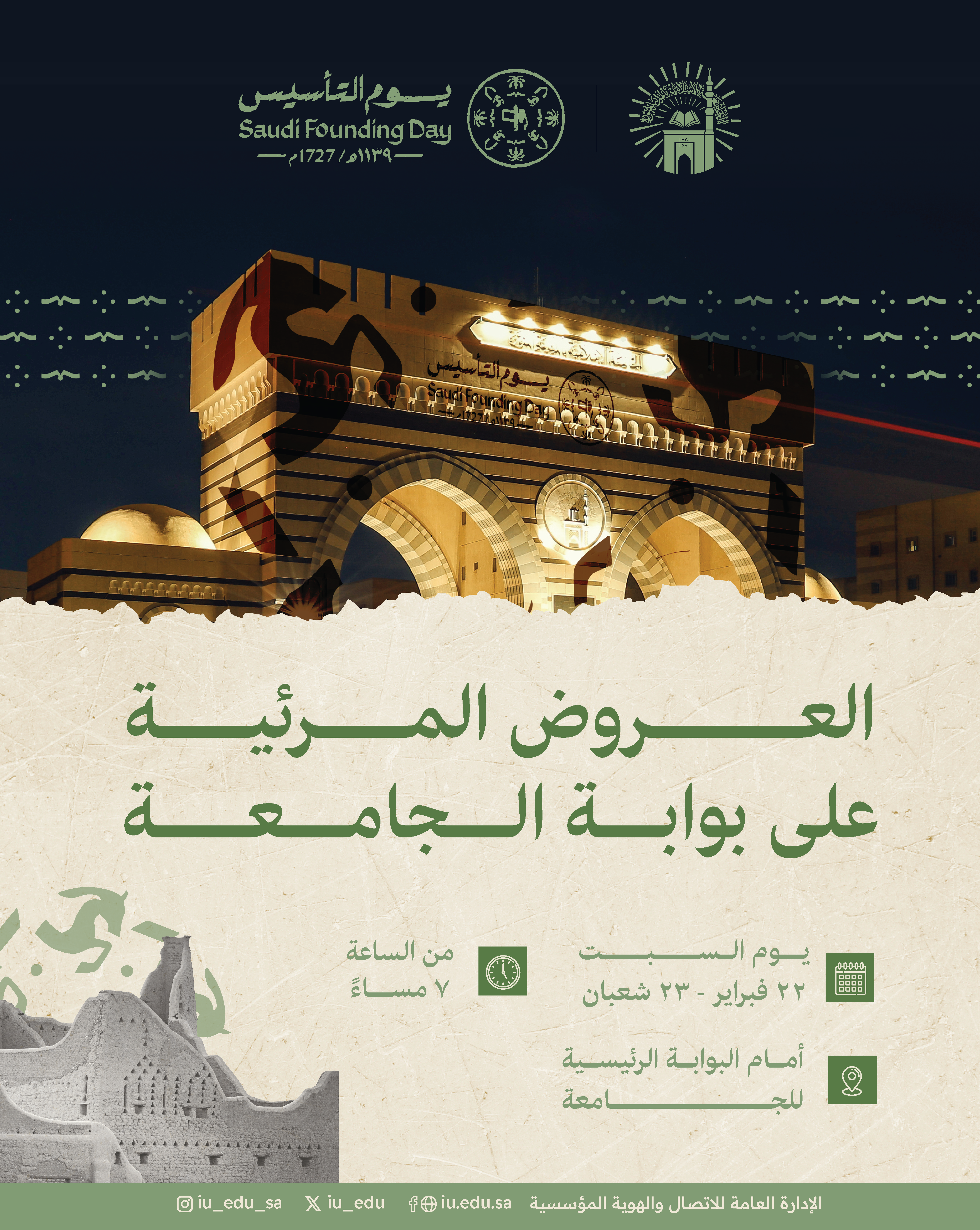 بوابة الجامعةالإسلامية تتوهج بالعروض المرئية احتفاءً بيوم التأسيس.
