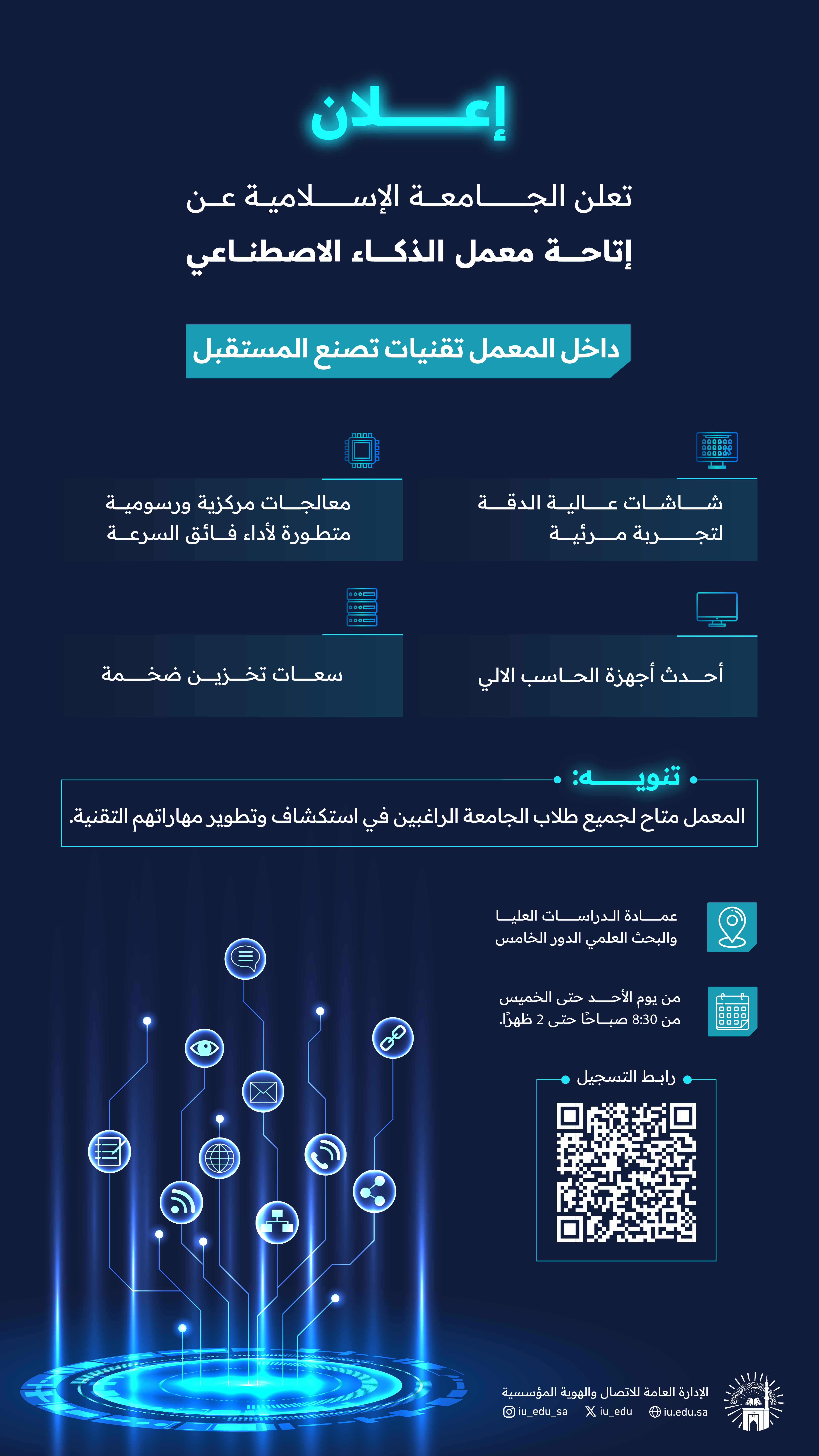 تعلن الجامعة الإسلامية ممثلةً في مركز الذكاء الاصطناعي عن إتاحة معمل الذكاء الاصطناعي، وذلك في إطار توفير بيئة تعليمية متطورة تشجع الإبداع والابتكار والبحث العلمي لدى طلاب الجامعة.