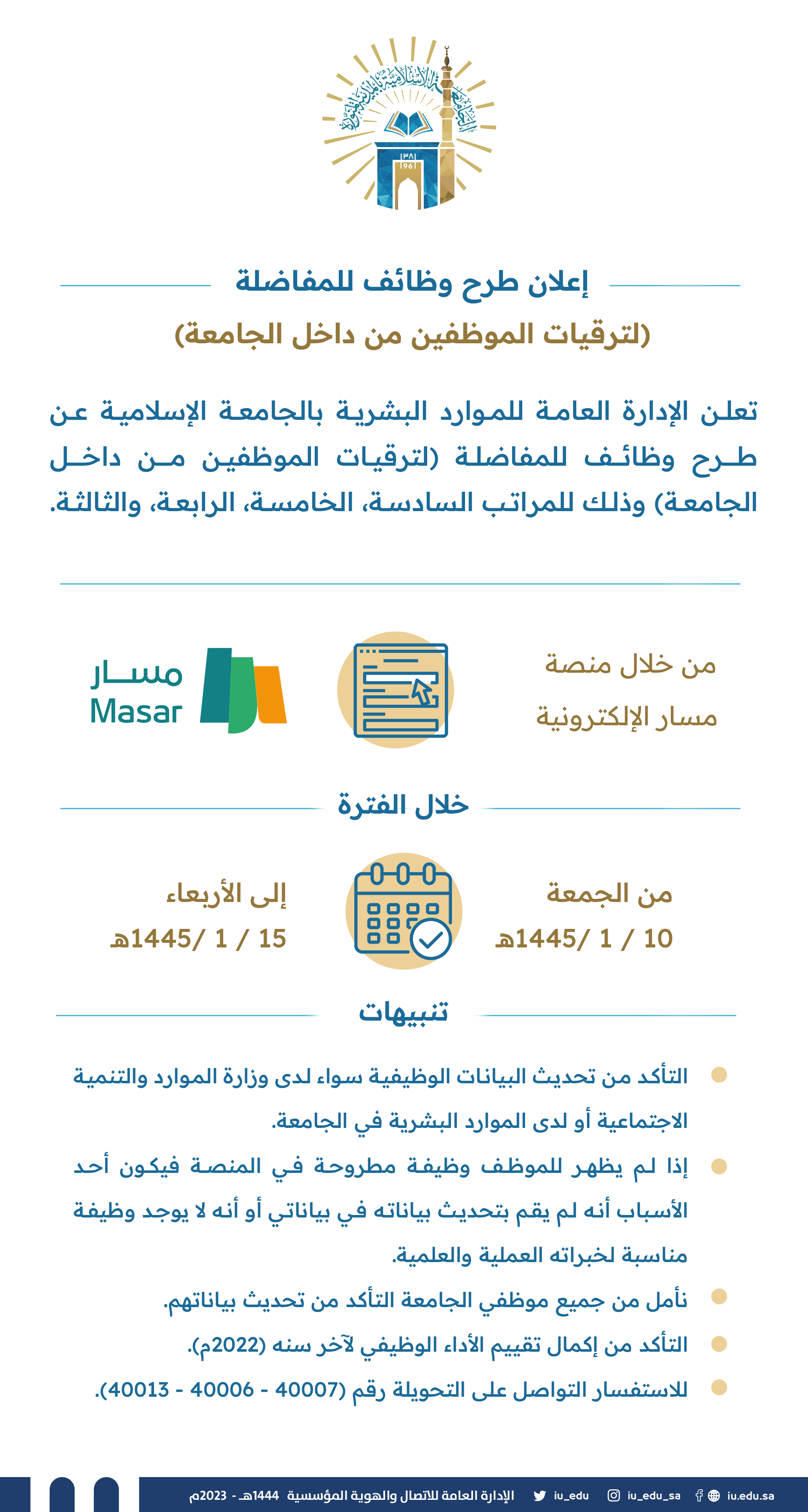 تعلن الإدارة العامة للموارد البشرية بـ الجامعة الإسلامية عن طرح وظائف للمفاضلة (لترقيات الموظفين من داخل الجامعة) وذلك للمرتبة السادسة والخامسة والرابعة والثالثة من خلال منصة مسار الإلكترونية من خلال الفترة من الأحد ٢١ ذي الحجة إلى الثلاثاء ٣٠ ذي الحجة ١٤٤٤هـ