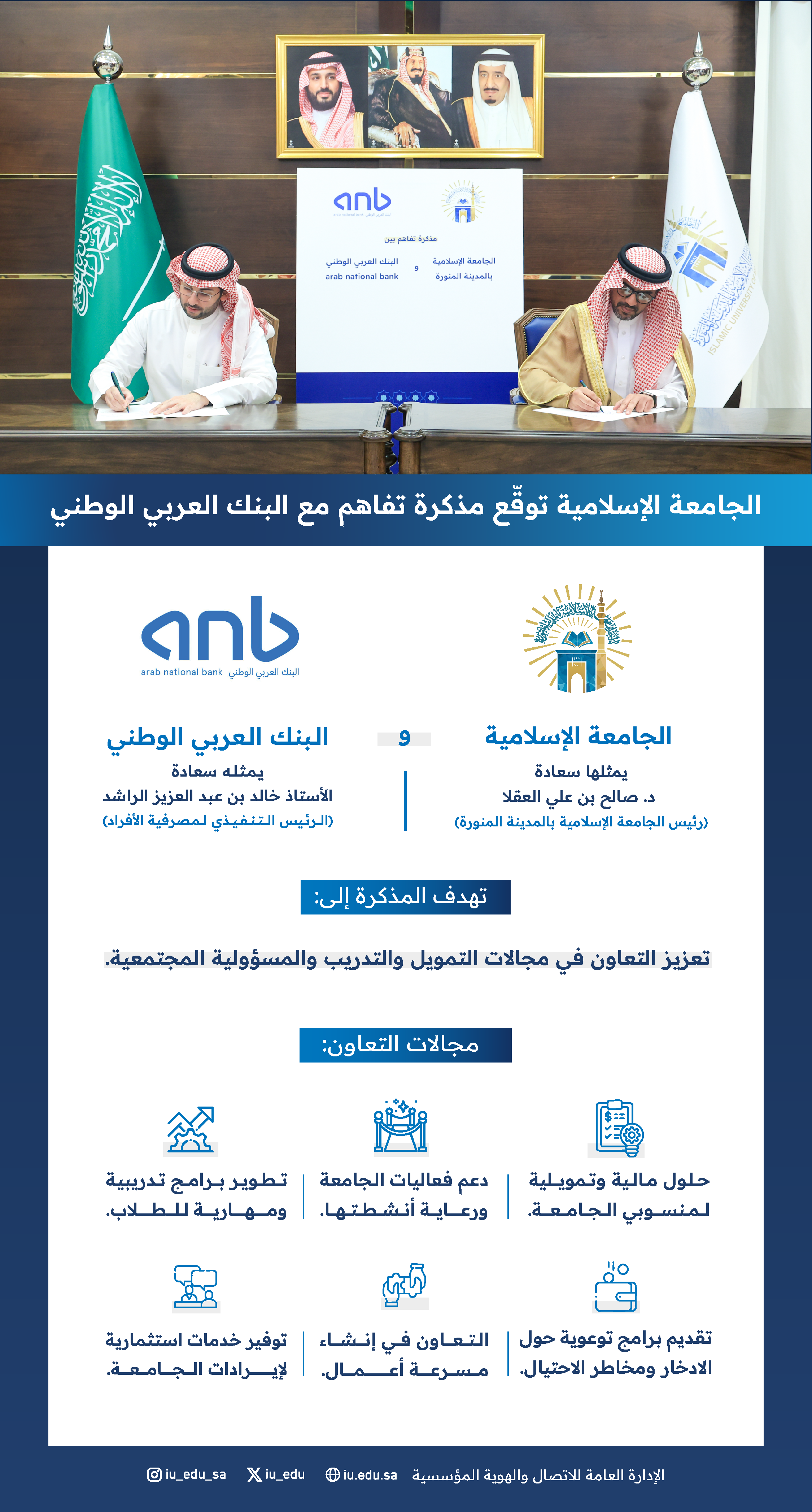 بحضور رئيس الجامعة الإسلامية د. صالح بن علي العقلا والرئيس التنفيذي لمصرفية الأفراد بالبنك العربي الوطني أ. خالد الراشد. وقّعت الجامعة، اليوم، اتفاقية تعاون مع البنك؛ لتعزيز مجالات التمويل، والتدريب، والمسؤولية المجتمعية ورعاية فعاليات وأنشطة الجامعة للعام القادم.