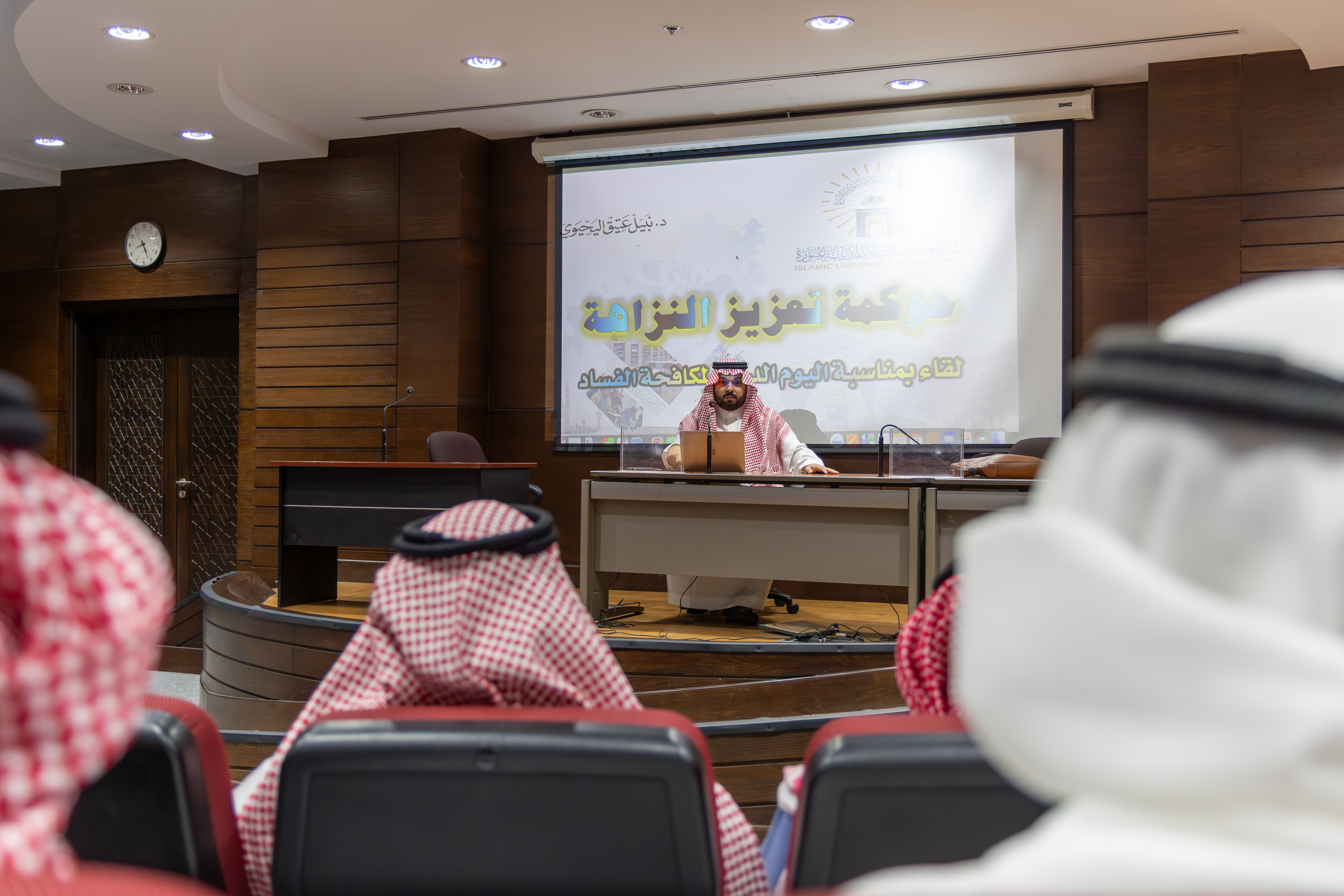 وتضمّنت الفعاليات عقد ورشة عمل عن بُعد بعنوان «النزاهة مسؤولية وطن» قدّمها د. إبراهيم الحبيشي، إضافة إلى لقاء حضوري بعنوان «حوكمة تعزيز النزاهة» قدّمه د. نبيل اليحيوي بكلية الشريعة، تناول أسس الحوكمة وأثرها في تعزيز قيم النزاهة المؤسسية،