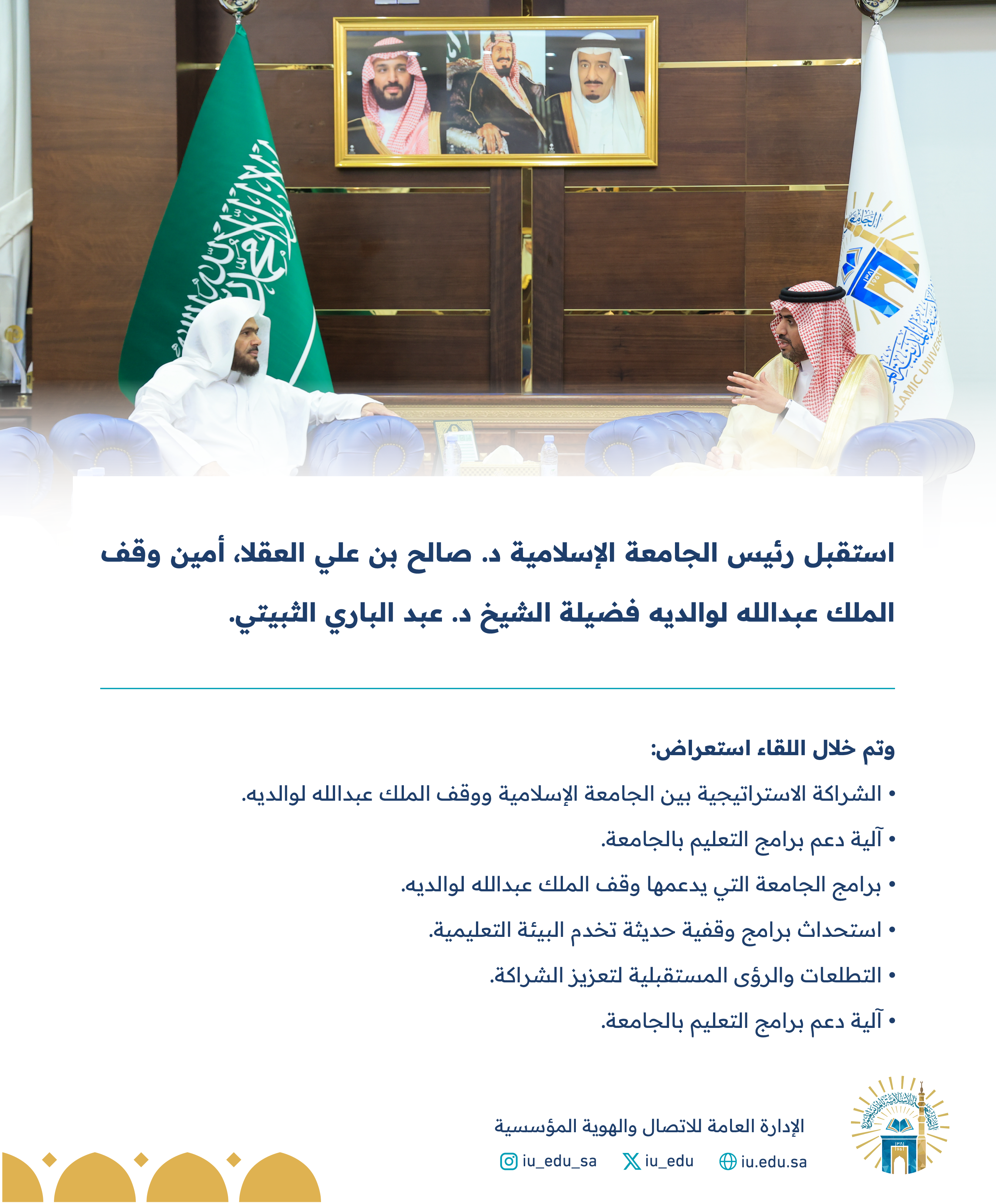 استقبل رئيس الجامعة الإسلامية د. صالح بن علي العقلا، أمين وقف الملك عبدالله لوالديه فضيلة الشيخ د. عبدالباري الثبيتي، وتم خلال اللقاء استعراض الشراكة الاستراتيجية بين الجامعة الإسلامية ووقف الملك عبدالله لوالديه، وآلية دعم برامج التعليم بالجامعة، إضافةً إلى استحداث برامج وقفية حديثة تخدم البيئة التعليمية.