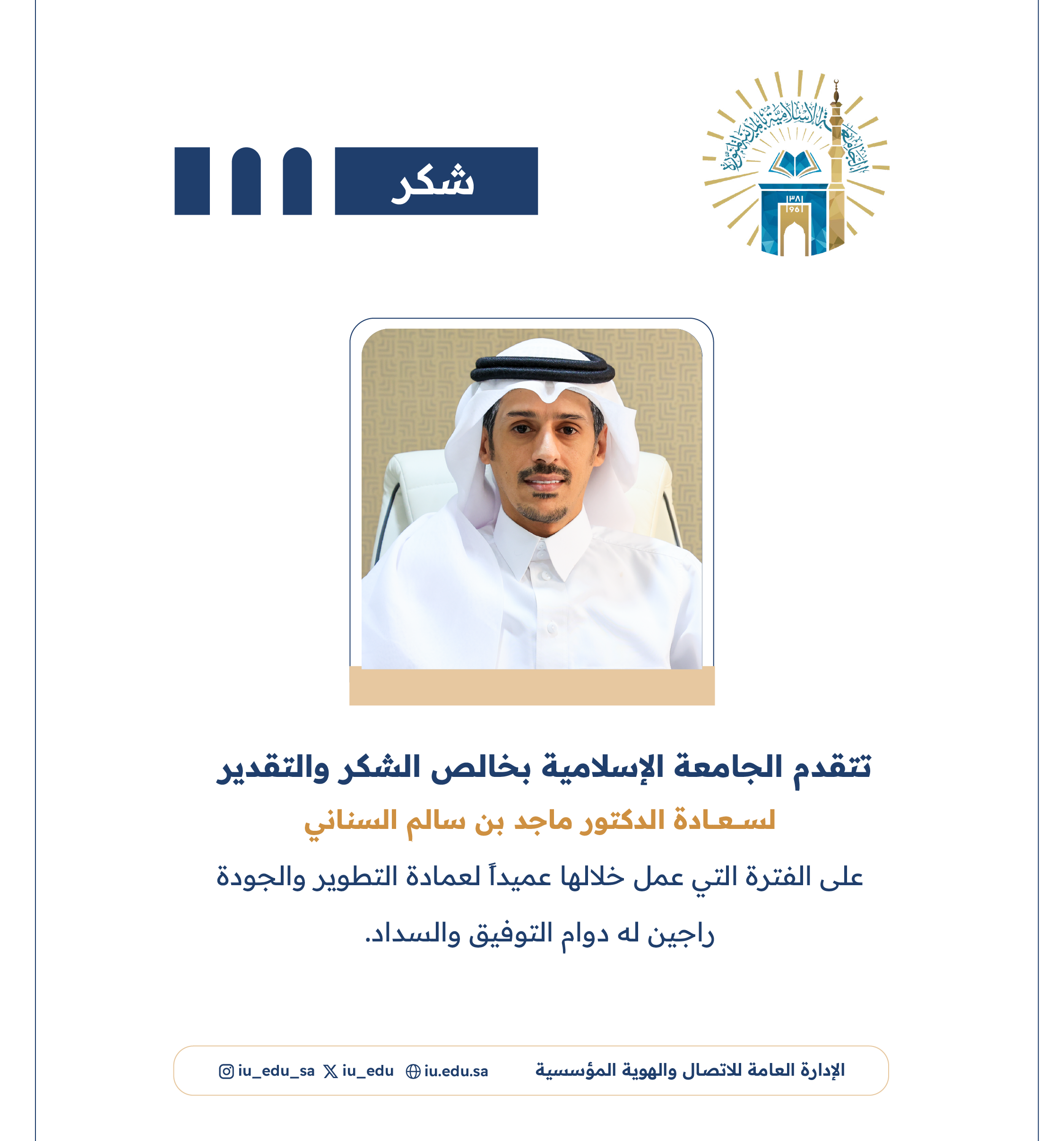 الجامعة الإسلامية تشكر سعادة الدكتور ماجد بن سالم السناني