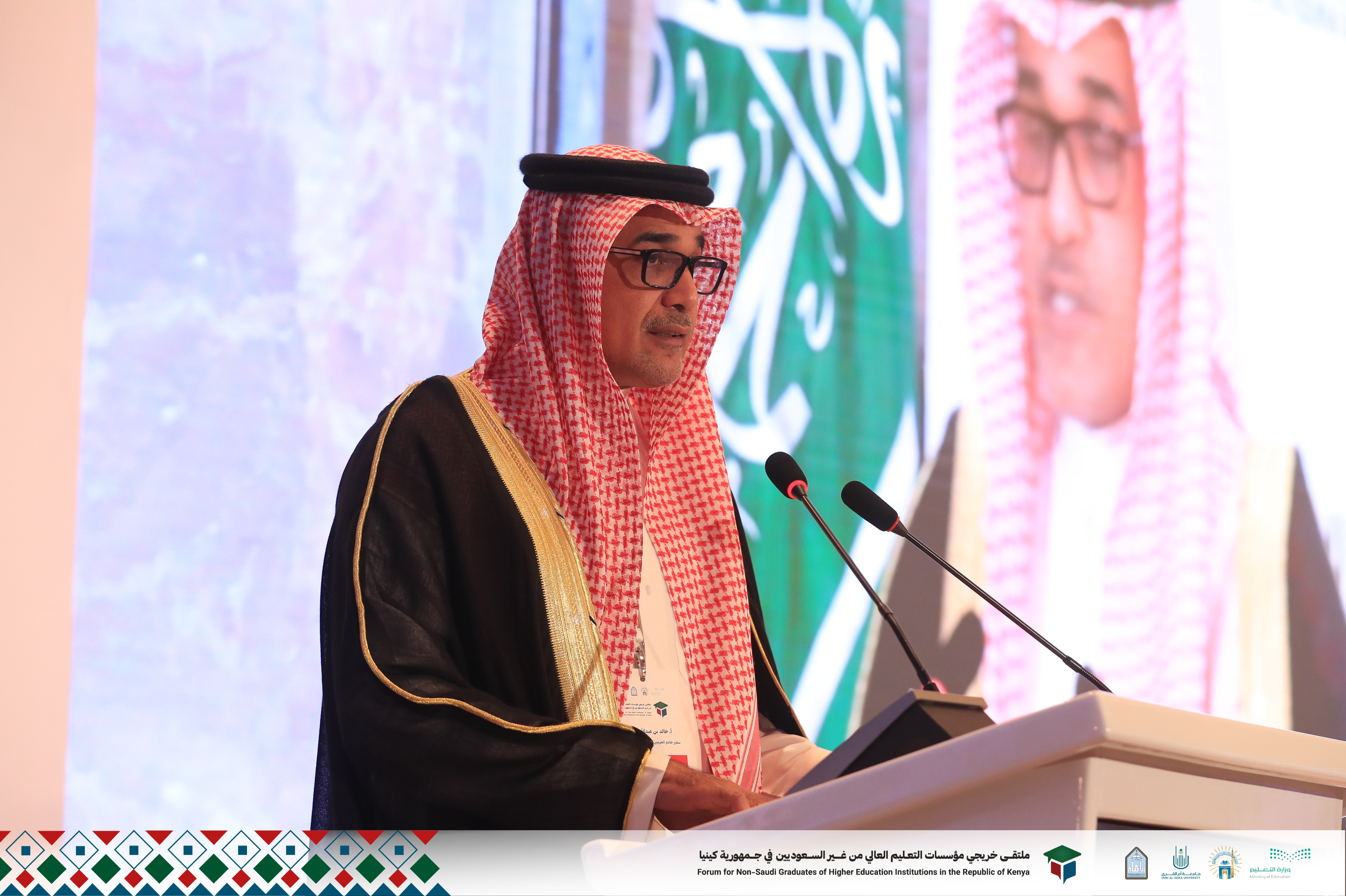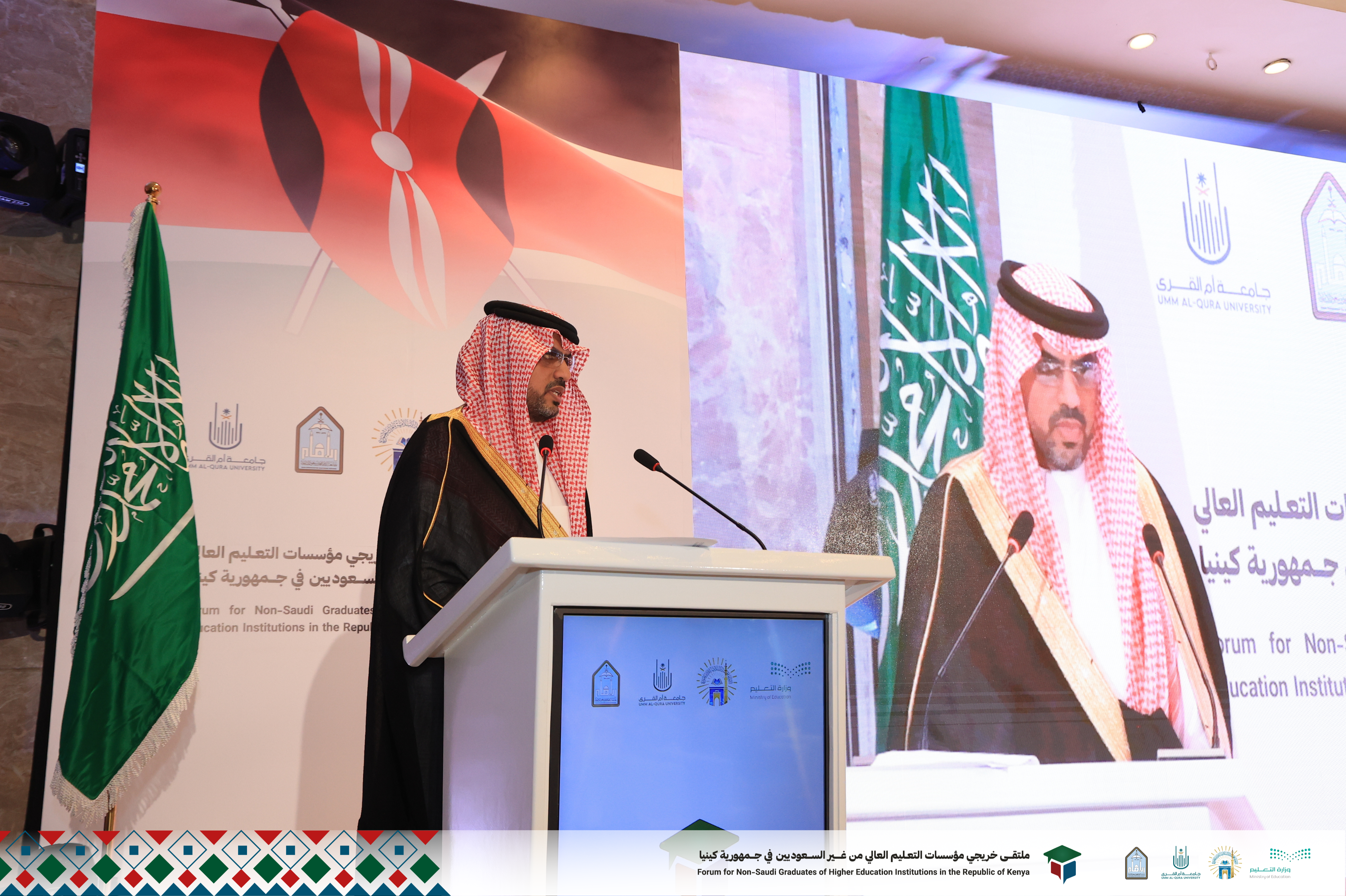كما قال سعادة سفير خادم الحرمين الشريفين لدى جمهورية كينيا: "ومن هذا المنبر، أجدد الدعوة لأبنائنا وإخواننا الطلاب والباحثين والمهتمين، انضموا إلى قافلة إخوانكم الطلاب المتجهة إلى المملكة العربية السعودية، واكمال مسيرة تجربة مميزة لمن سبقكم بالعلم والتعلم من الكوادر الكينية، الذين نراهم اليوم يخدمون وطنهم ويسهمون في تنمية مجتمعهم. حيث تهدف تطلعات وزارة التعليم في المملكة إلى تحقيق مخرجات برنامج المنح الدراسية بما يتوافق مع رؤية المملكة العربية السعودية ۲۰۳۰ من خلال دعم ومشاركة الخريجين بعد تخرجهم في دفع عجلة التطور في بلدانهم بعد عودتهم مؤهلين بالشهادات العلمية التخصصية وتطبيق ما اكتسبوه بين المملكة العربية السعودية من مهارات وخبرات في جميع التخصصات. وفي الختام، أود التأكيد على أهمية هذا الملتقى الذي يعزز العلاقات مع جمهورية كينيا الصديقة خاصة في الجانب التعليمي والبحثي وترسيخ الروابط العلمية بين المؤسسات التعليمية لكلا البلدين".