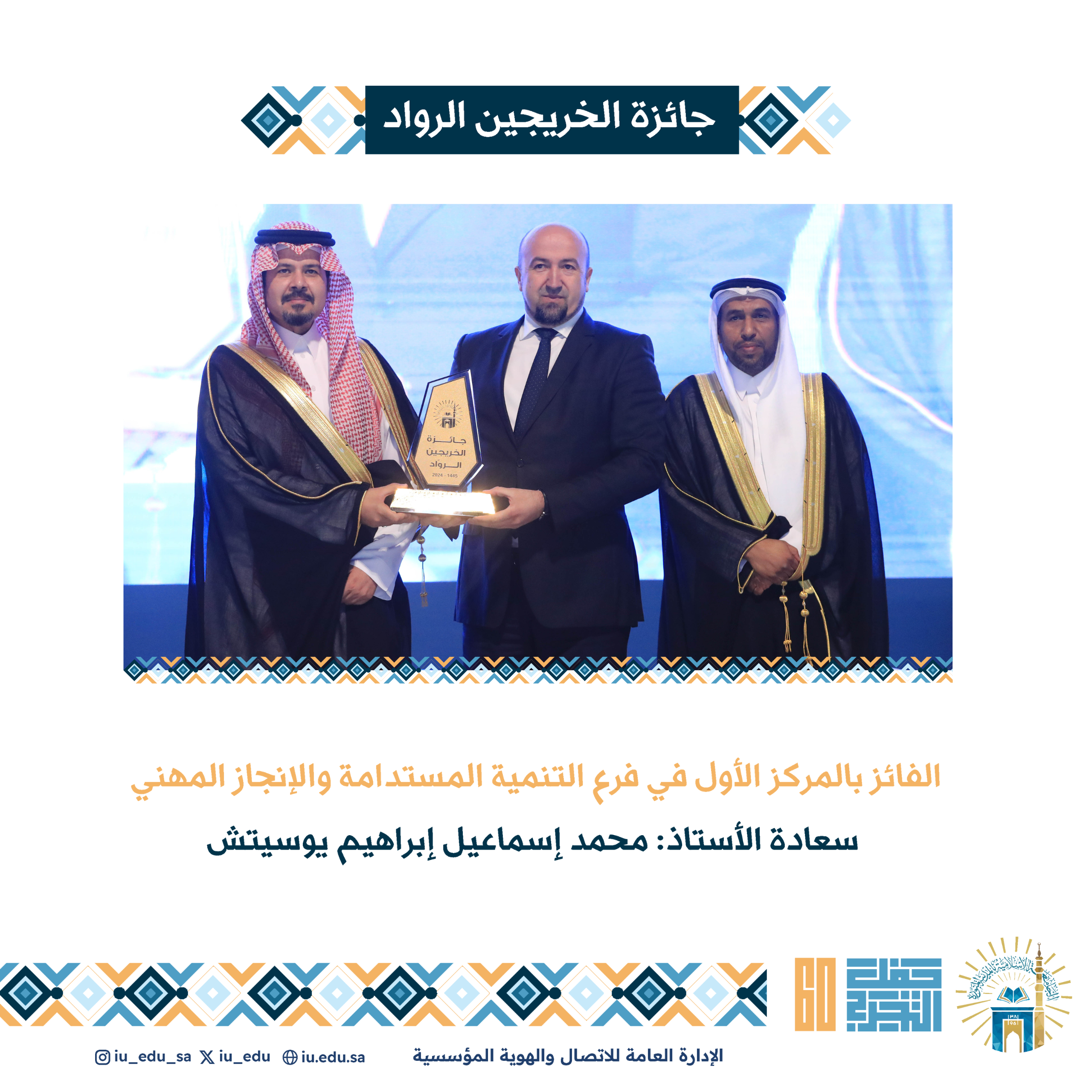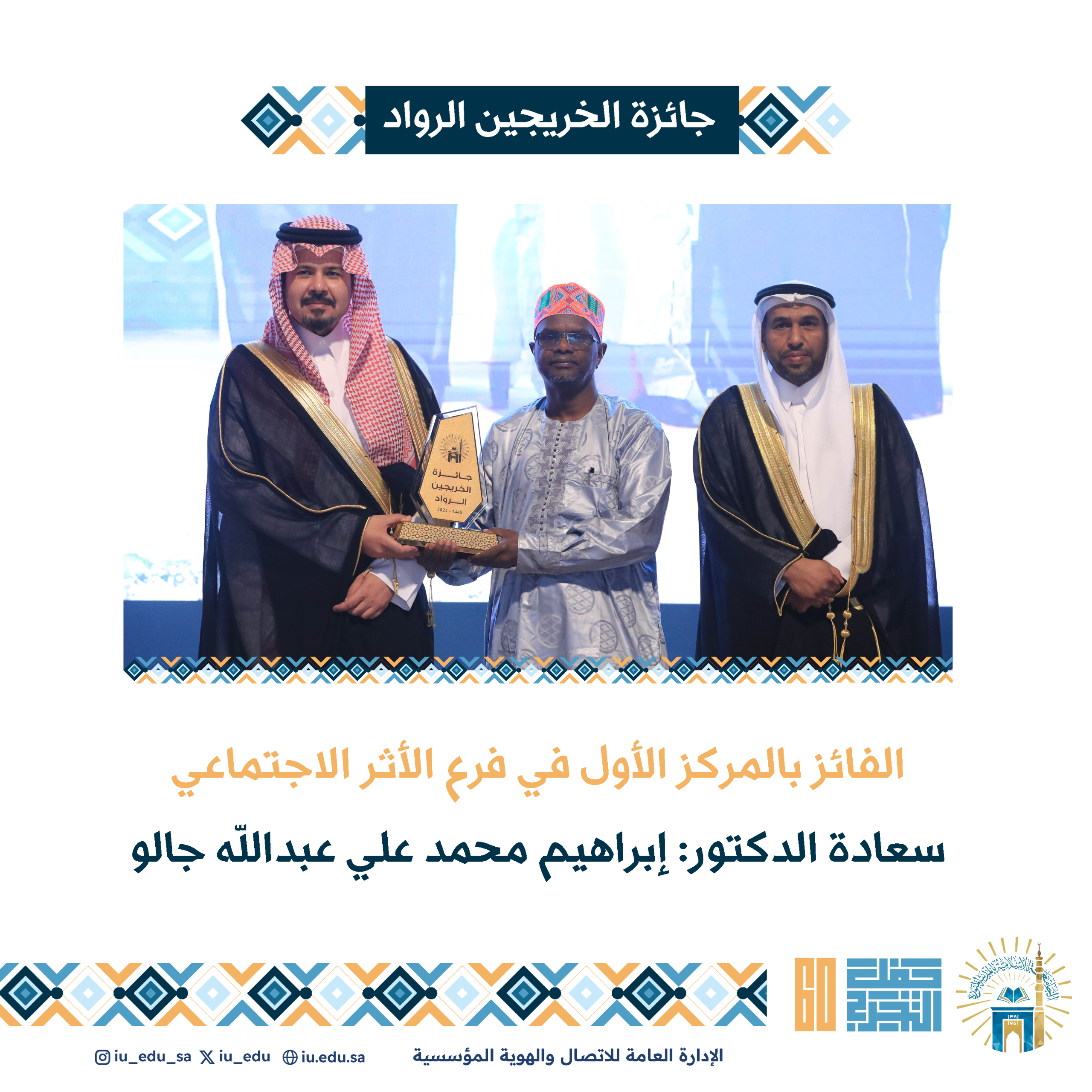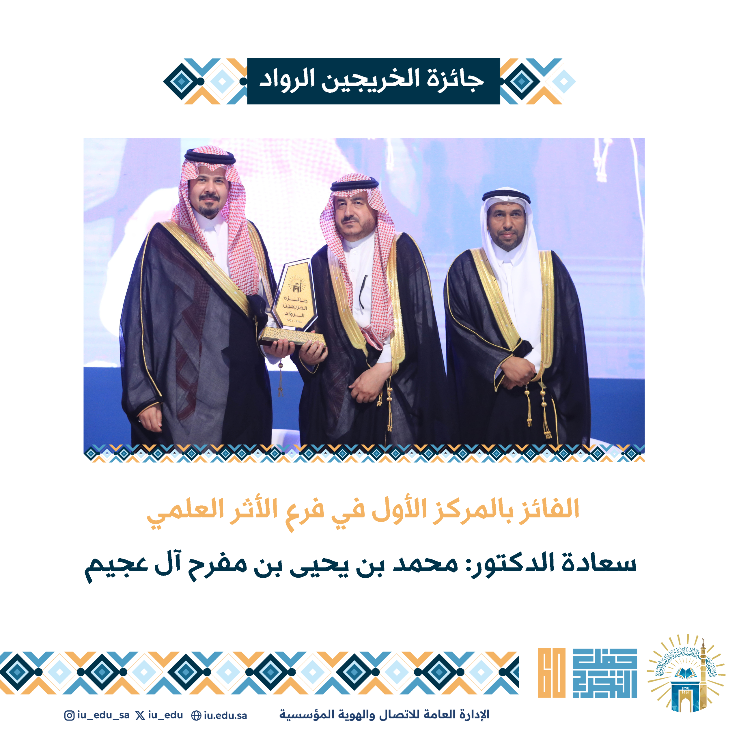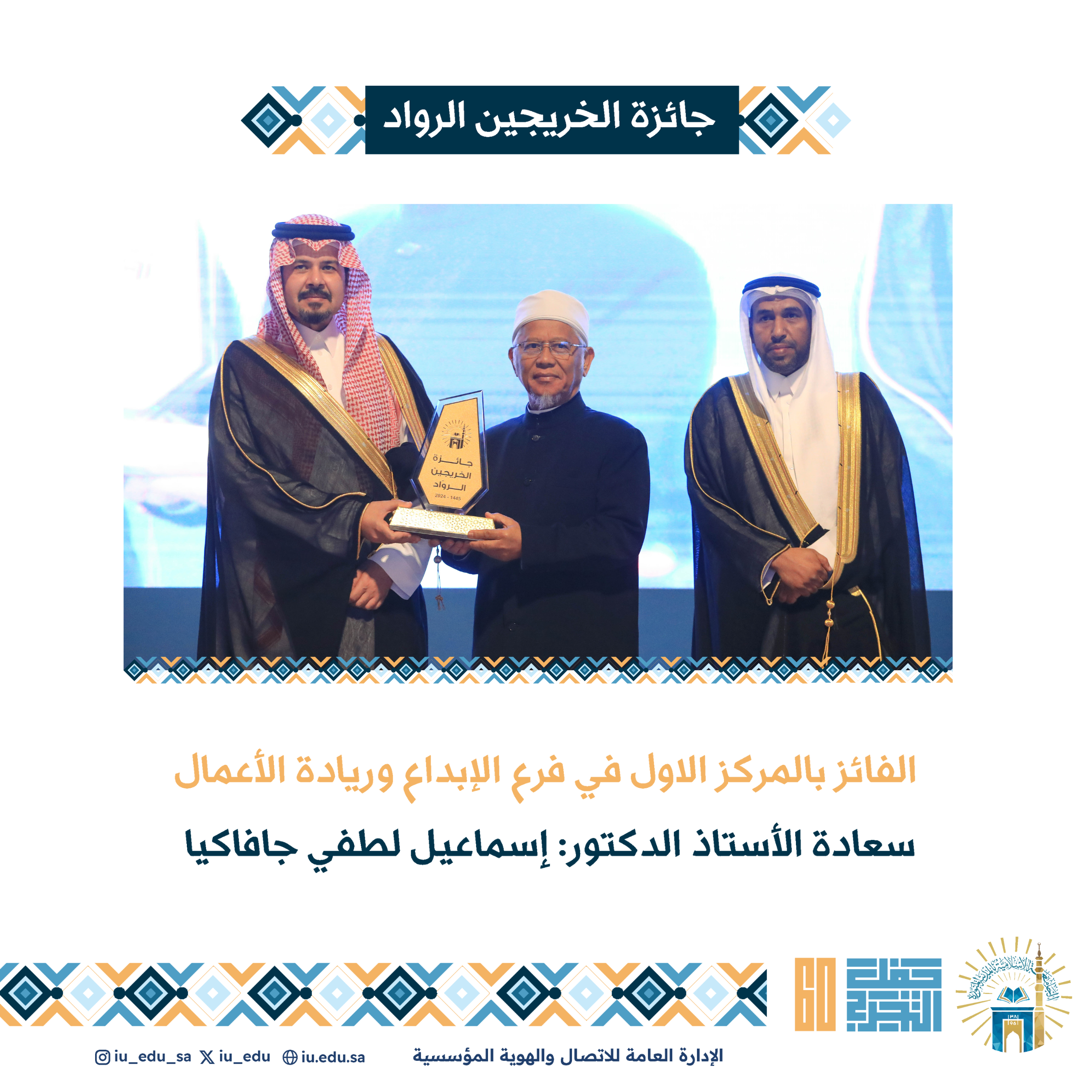 ثم شاهد الحضور عرضًا مرئيًا عن "جائزة الخريجين الرواد" السنوية التي تقدمها الجامعة الإسلامية لخريجيها المتميزين في مختلف المجالات العلمية والعملية، وهي جائزة سنوية تقدمها الجامعة لخريجيها المتميزين منذ تأسيسها وحتى الآن، وفي نهاية الحفل، كرم سمو أمير منطقة المدينة المنورة، الفائزين بالجائزة وأعضاء لجنة التحكيم والتقطت الصور التذكارية مع خريجي الجامعة.