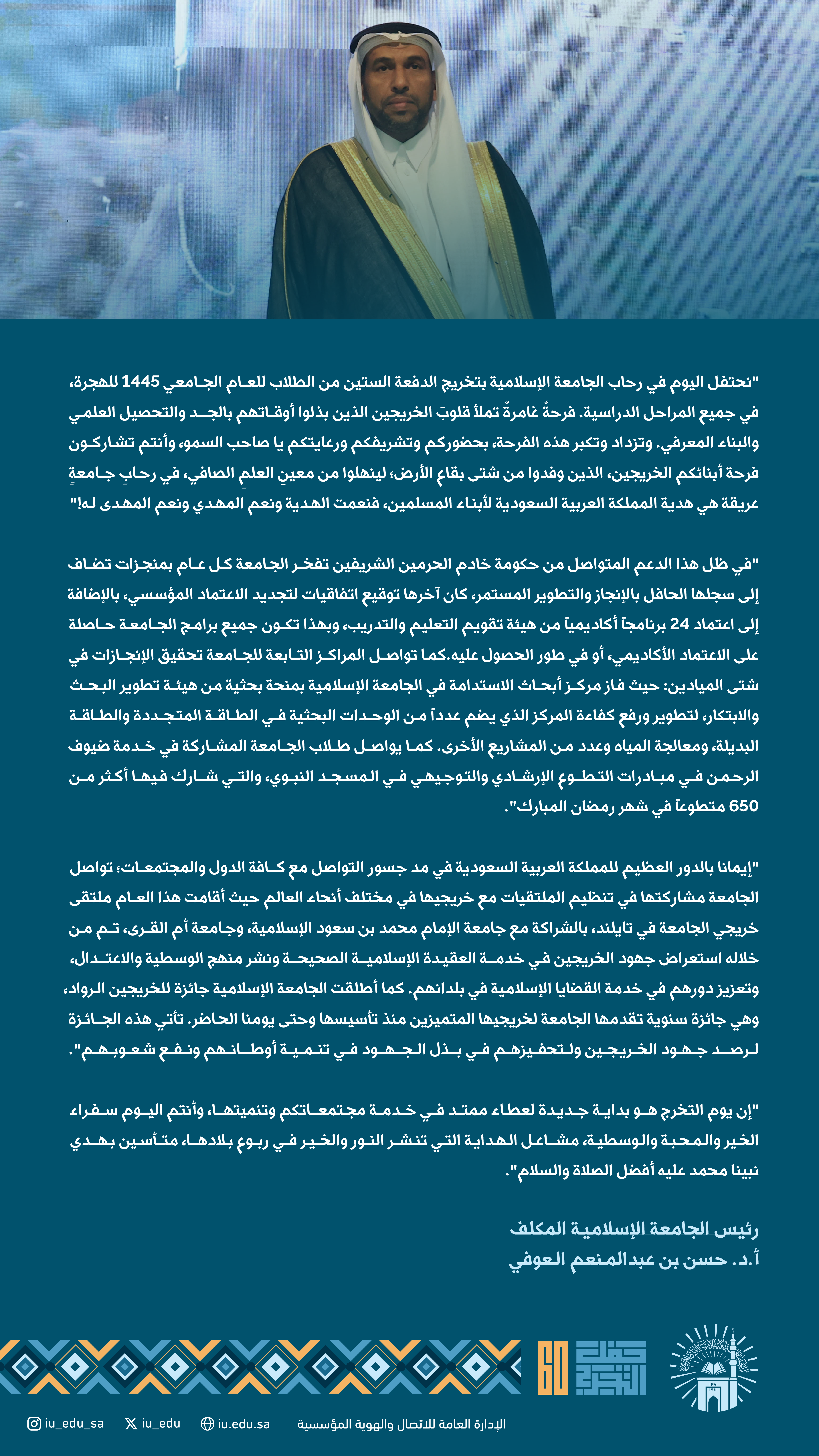 عقب ذلك، أكد رئيس الجامعة الإسلامية المكلّف الدكتور حسن بن عبدالمنعم العوفي، في كلمته، أن للجامعة ريادة عالمية في تعزيز المعرفة وتحقيق التأثير الإيجابي في خدمة المجتمعات، وهي هدية المملكة العربية السعودية للعالم أجمع، وتعمل على تخريج دارسي العلوم الشرعية والعربية المؤهلين في مجالهم ليكونوا إضافةً حقيقية في بلدانهم وسفراء للمنهج الوسطي السمح وينشرون العلم المفيد في أوطانهم ومجتمعاتهم.